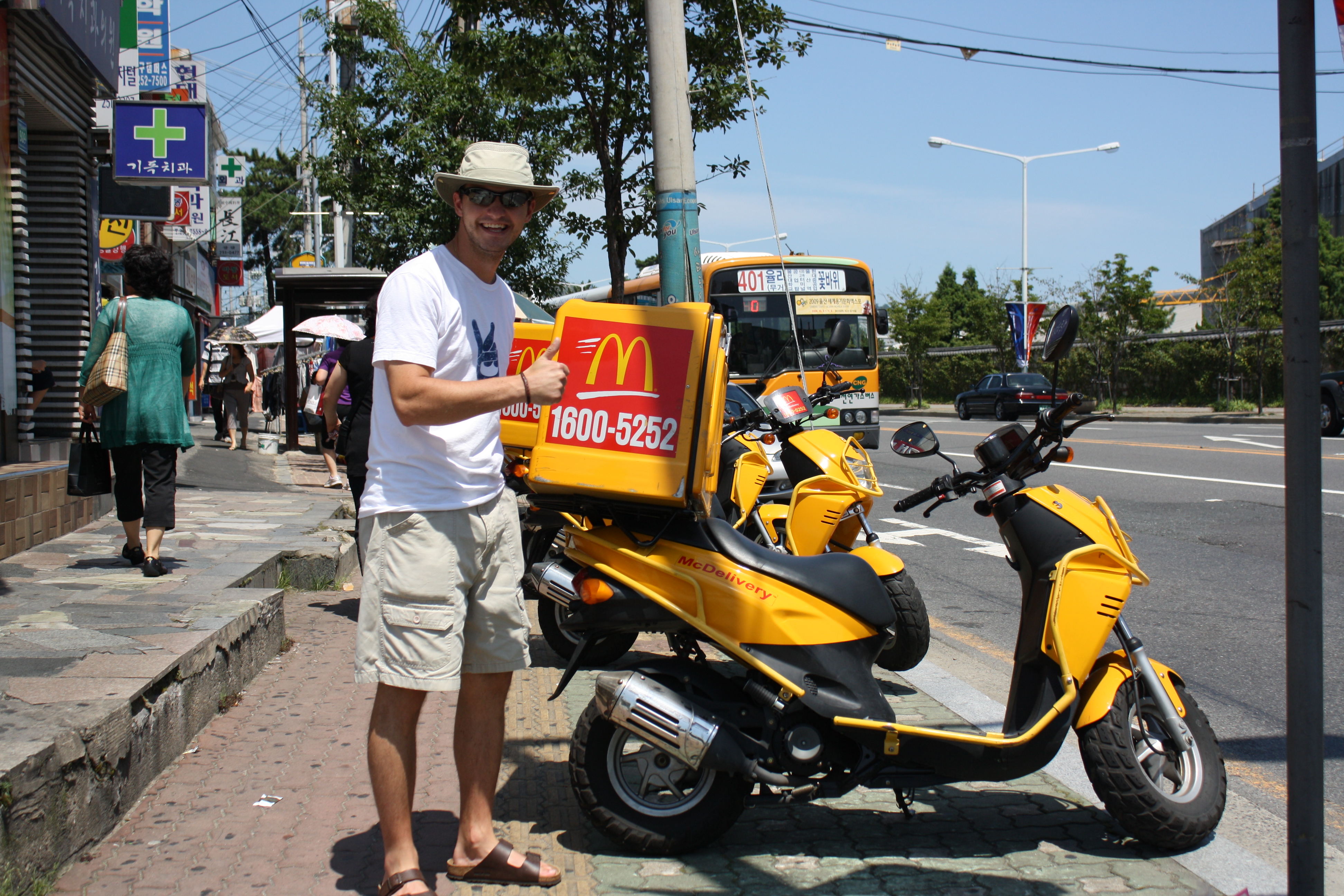 Everywhere you look there are cell phone stores, often 6-10 on a block. Everyone has a cell phone, children run around with them at about the age of 4. Video games are huge. The internet connections are some of the best in the world. Our new favourite store, Home Plus, has shopping carts that you have to put a 100 won coin (about a dime) in before you can release it from the chain so that people don’t leave the carts all over the place. You can’t get the coin back until you attach it back to the other carts. The store is a 4 level box store with everything from groceries to computers. Instead of escalators they have moving ramps that when you put your cart on the wheels lock so it won’t roll away. Inside the stores they have people who sit there all day and clean the escalator railings. Everything is spotless – I mentioned before the revolving plastic wrap on the toilet seats. And if that’s not enough to convince you, McDonald’s delivers. Yup, that’s right, McDelivery.