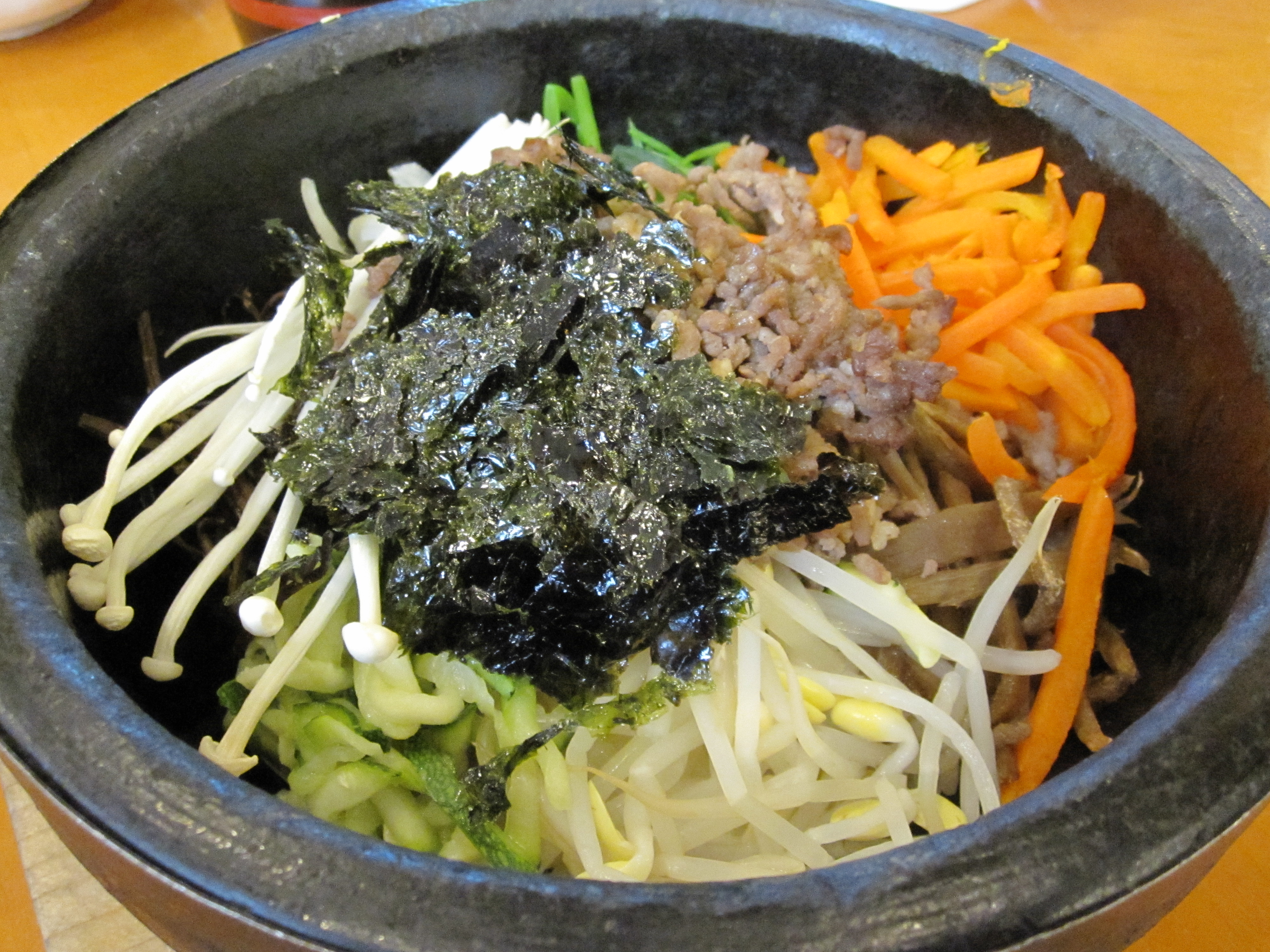 Bibimbap. Koreans love their rice. This is just a dish of rice topped with some veggies and maybe some meat or an egg. And of course, accompanied with hot sauce.