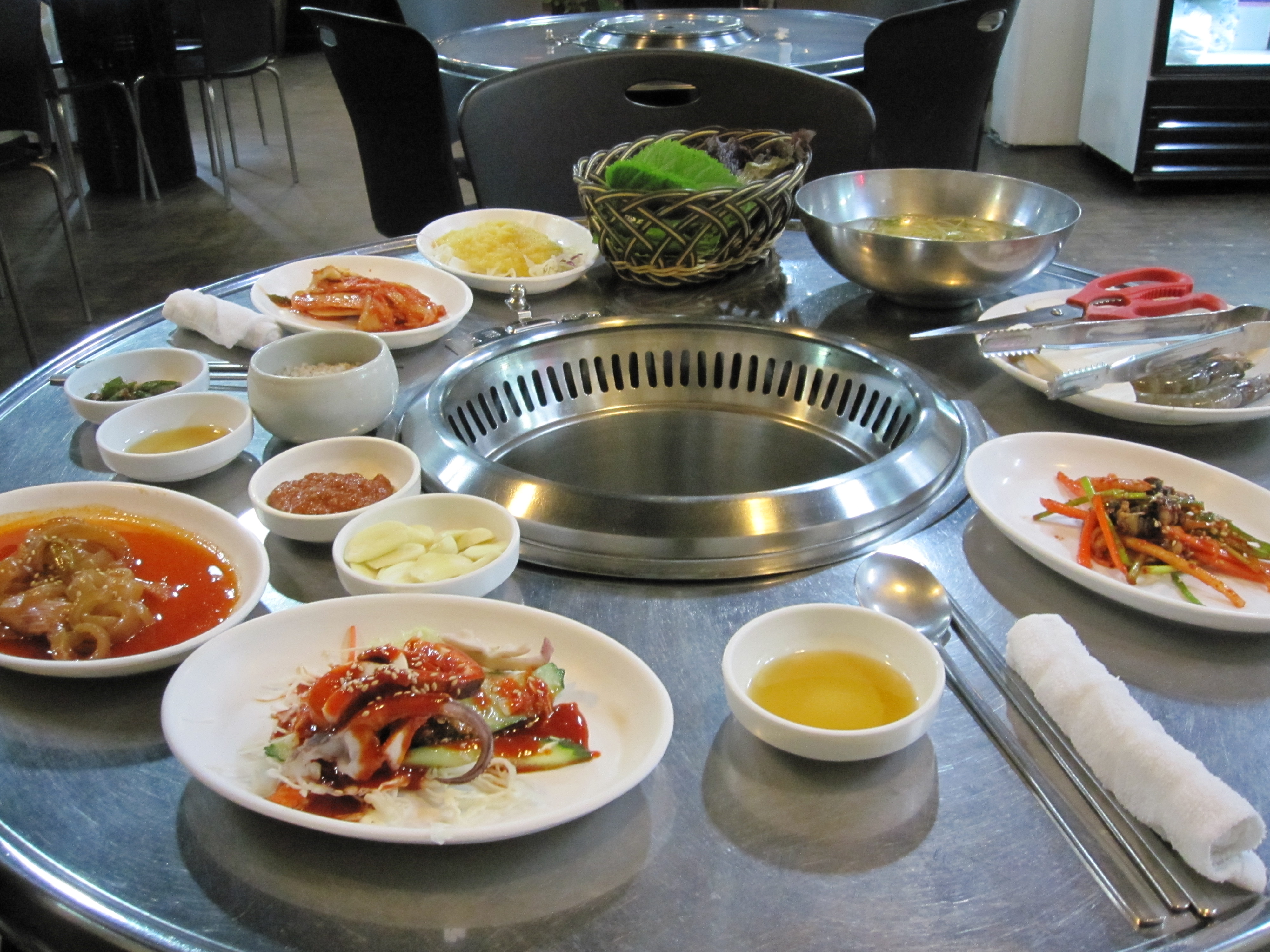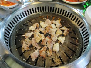 First our favourite meal in Korea – sumgyeopsal. It’s otherwise known as Korean barbeque. You can go to these restaurants all over Korea where you pay for meat based on a serving and then cook it at your own table. We normally get pork but you can also get seafood or beef. It is served with many side dishes, as is everything else in Korea.