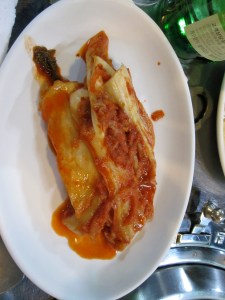And no post on Korean food would be complete without a picture of the treasured kimchi. Fermented cabbage in spicy pepper sauce. They make this once a year in the fall and then store it for the remainder of the year in a special kimchi fridge.