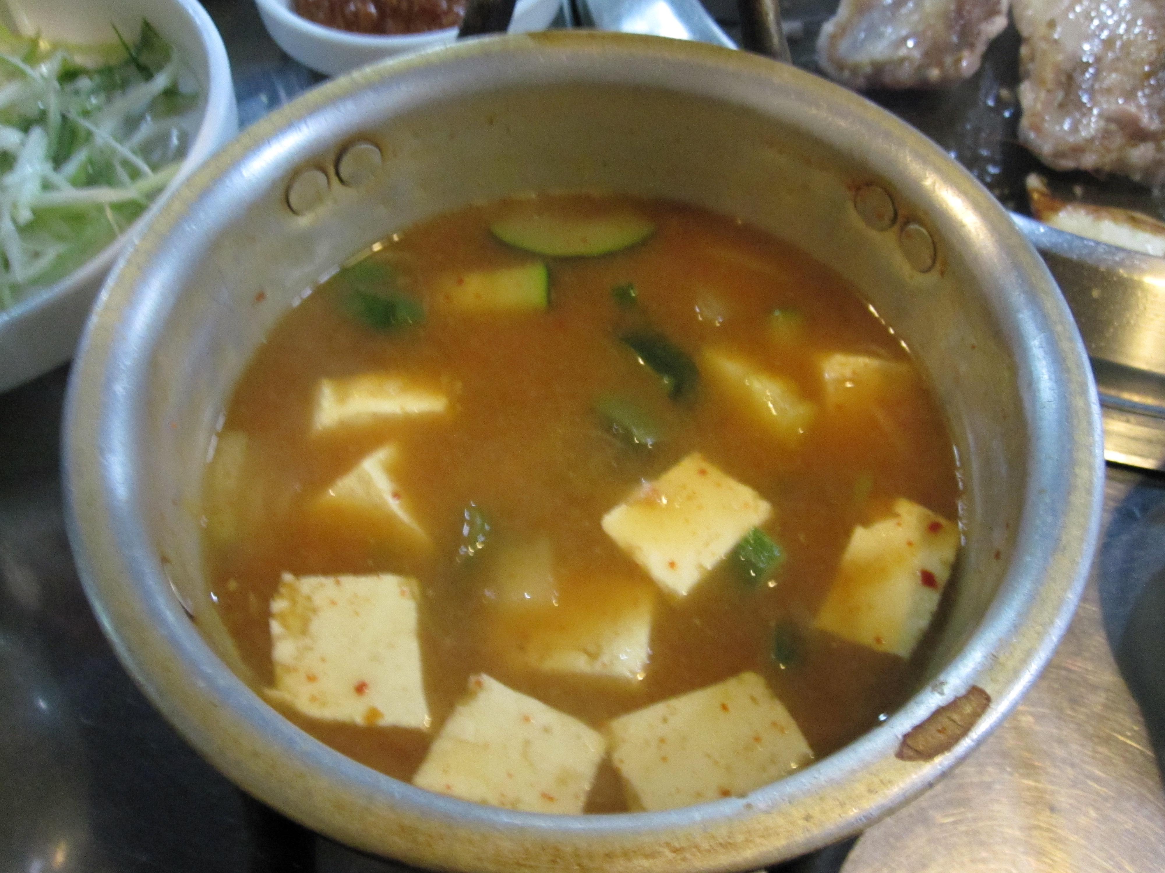 We eat a lot of soup here. There is soup served with every meal. Usually its ground up fish soup with some green onion. My favourite soup here is called Dwen-Jung Jiggae. I’ve also had Kimchi-jiggae and So-do-boo jiggae.