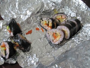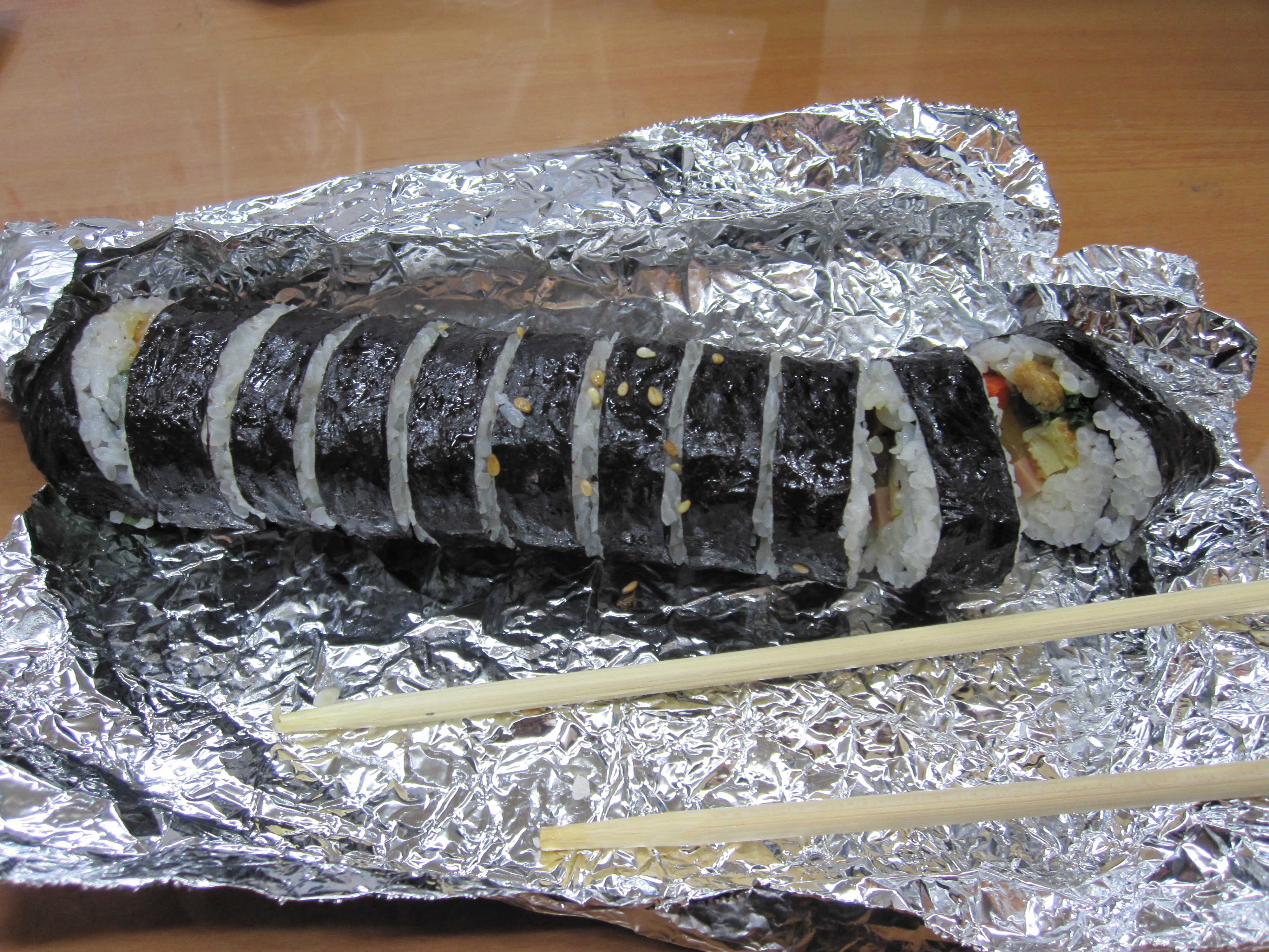 A staple in any Korean’s diet is Gimbap – Gim means seaweed and bap means rice. This is really similar to California roll sushi. It comes in many varieties, chum-chi gimbap (tuna), red bean gimbap, beef gimbap, pepper gimbap.