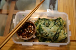 Korea’s take on pancakes. This one is filled with green onion. Another popular ingredient is octopus parts. I like mine vegetarian.