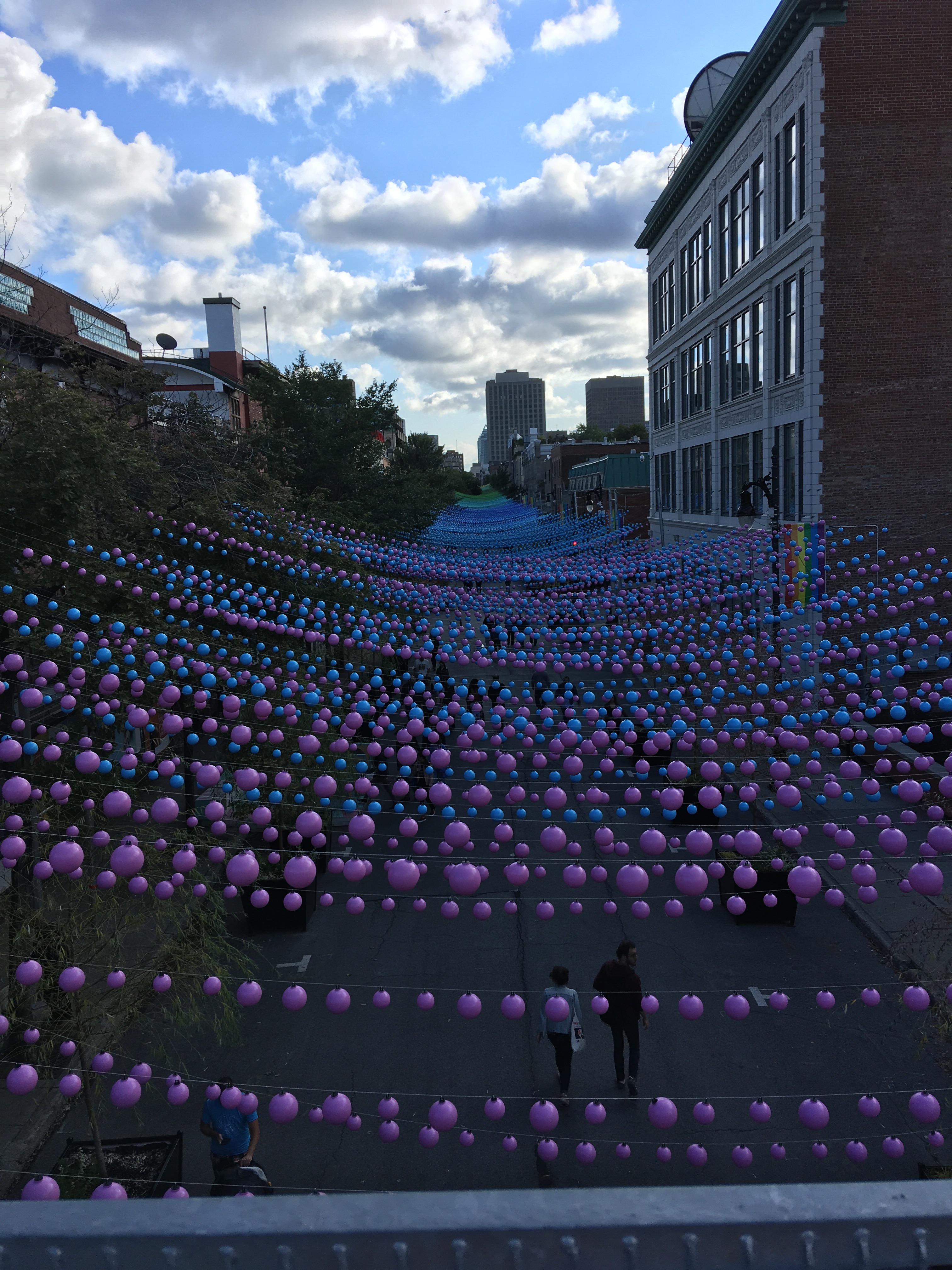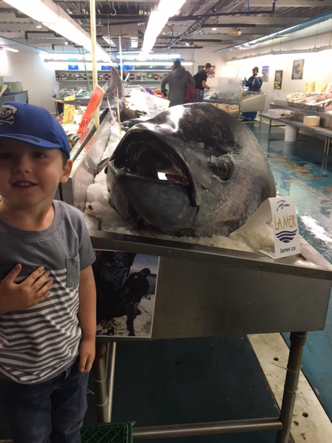 After nap time we headed out so Jacob could do some “work” to Poisonnerie La Mer. The kids liked the lobster tanks: “just like at the grocery store”-M and the huge tuna head. We walked to la mer via st. Catherine’s street which has been decorated for pride with thousands of hanging coloured balls to make a rainbow. They cover the street for about a kilometre. Madeline “just couldn’t believe that the sky was pink”. We got everyone home and tucked in to bed. The kids ended the night reading their new French Scaredy Squirrel book to each other in their “tent”.