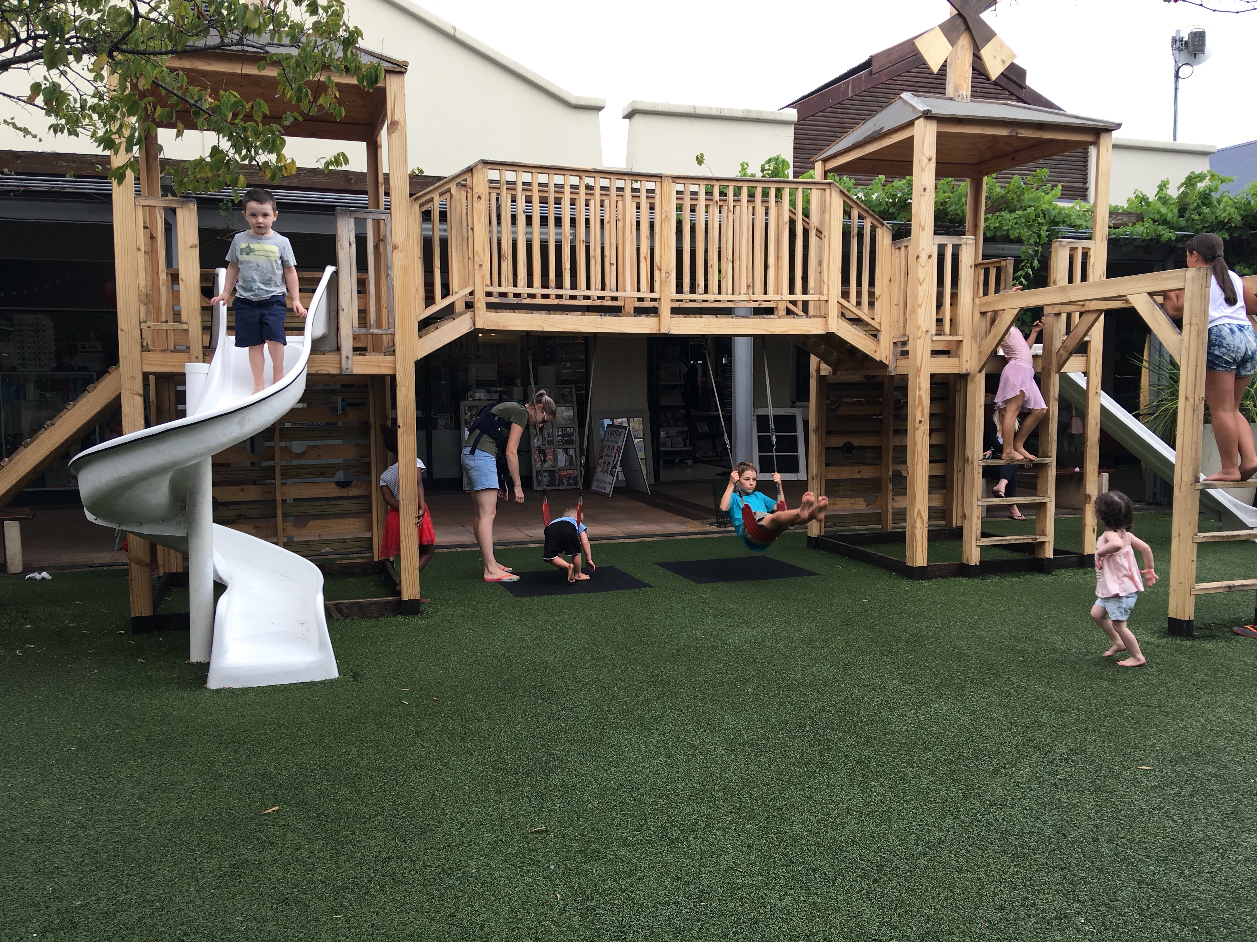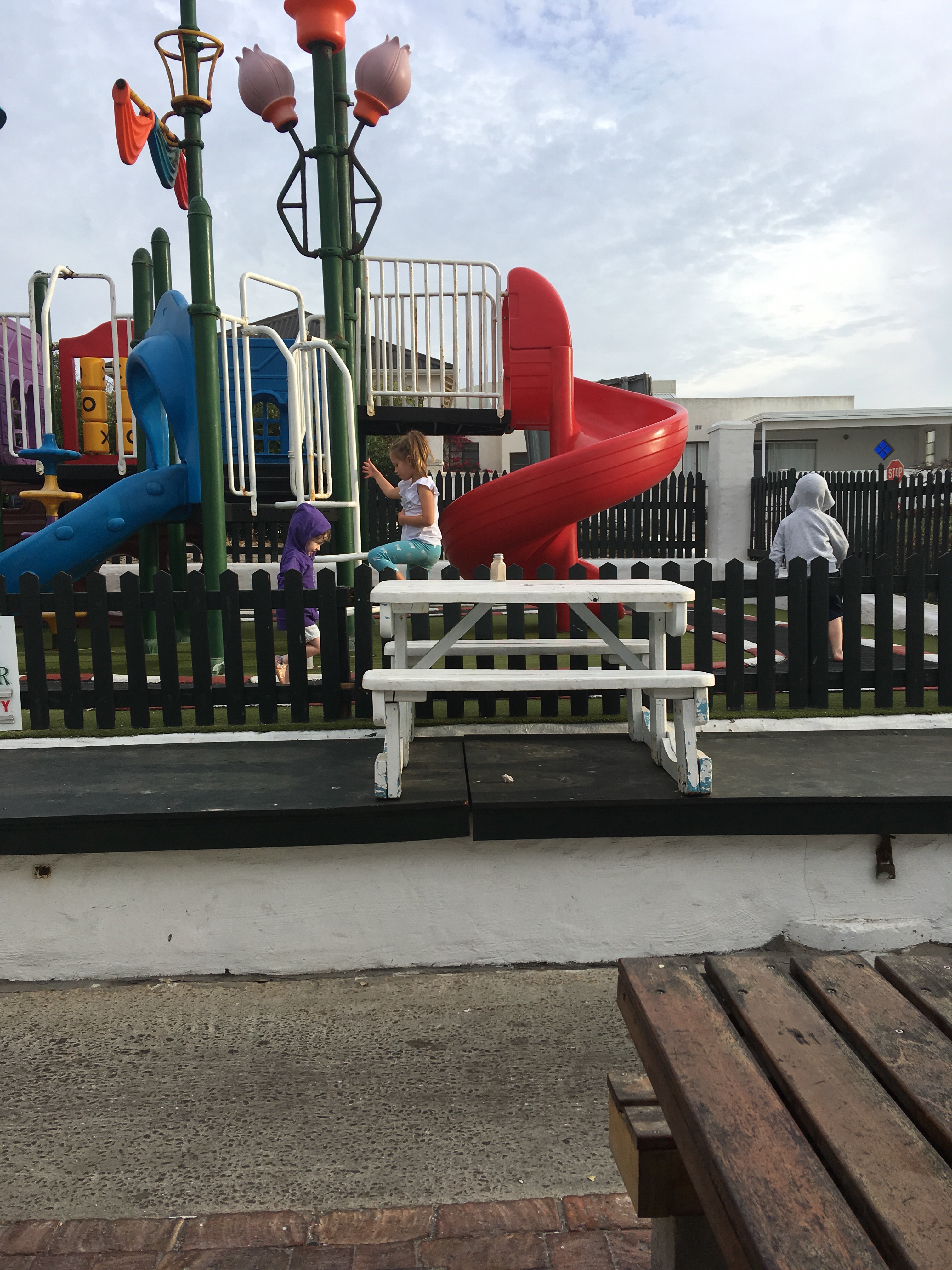After nap time we had some time to kill before we met up with Wendy, Christo, Janelie and Nollie for dinner so naturally we headed to the grocery store. Since very nearly everything in SA is designed for families the grocery store complex has a whole play structure right outside the entrance. Madeline, as per usual, had two older kids competing for her attention at the playground and she was led around like the little doll she is.