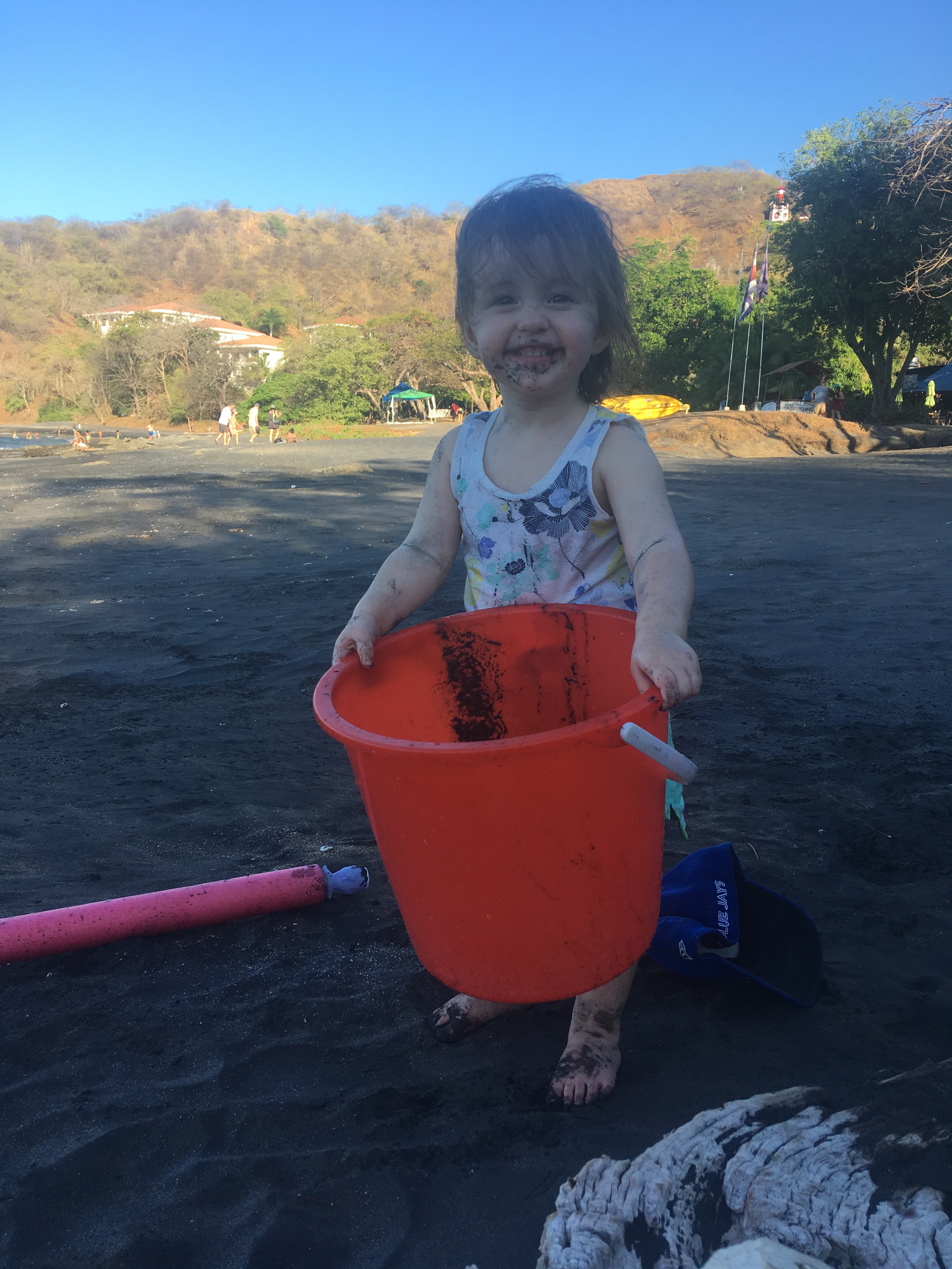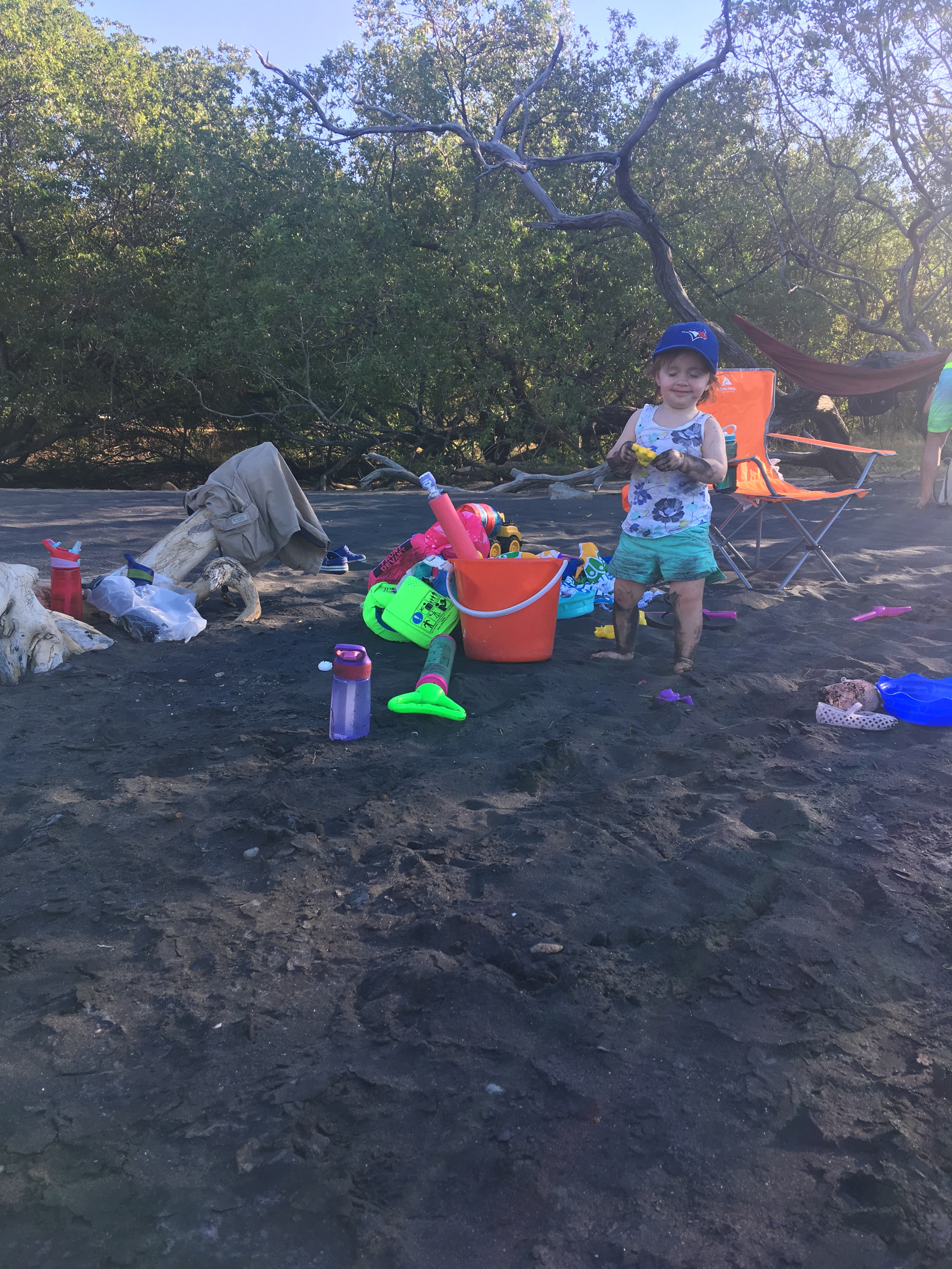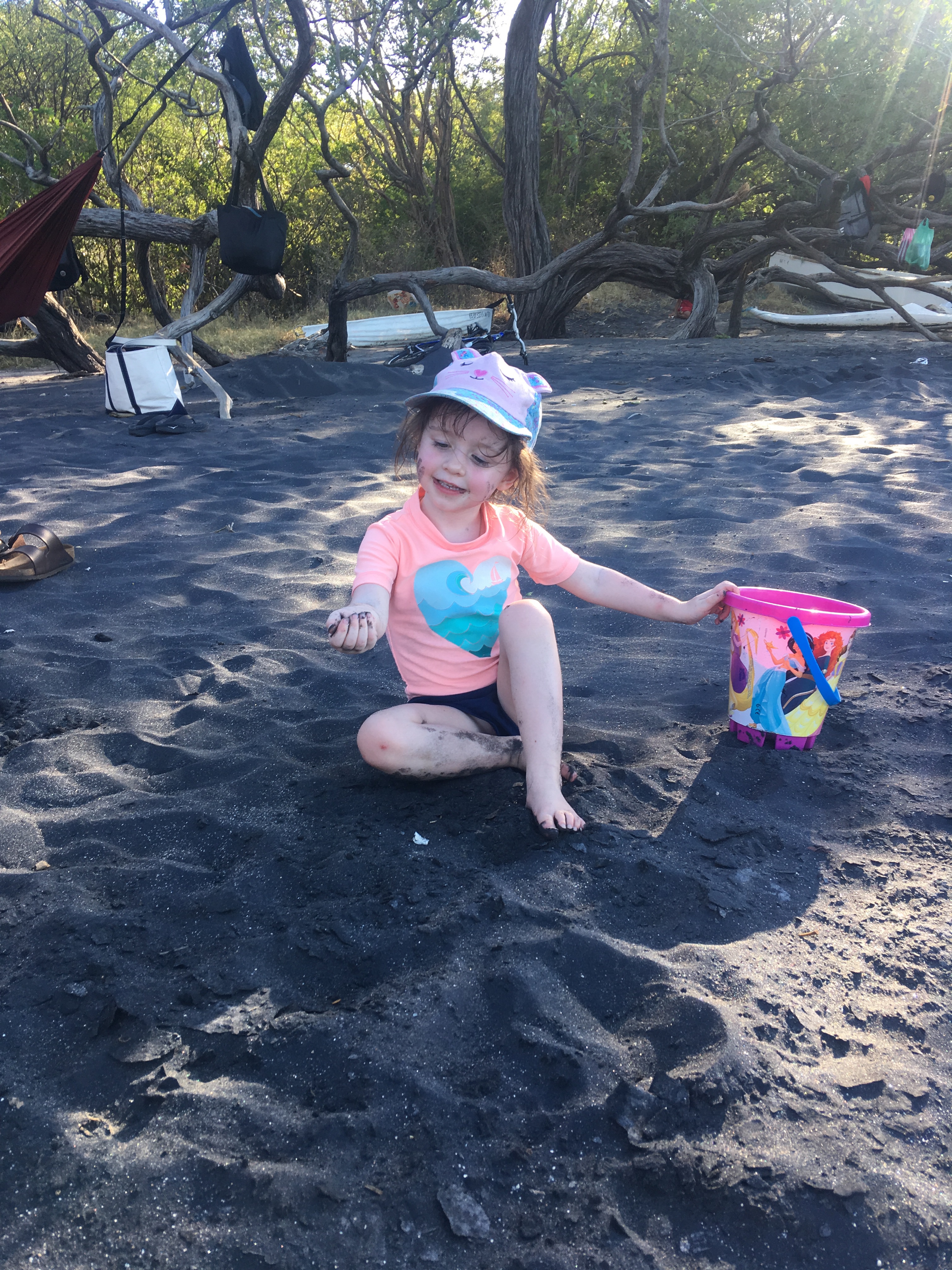 After nap time we headed to Playa Ocotal – the beach about 7km away to see how it compared to our local beach. It’s a black sand beach (from the volcanic activity) with cool trees reaching out over the sand. The sand was super cool, it’s soft and squishy and full of shells and pieces of coral. Everyone enjoyed the last few hours of sunlight on the beach before we had dinner at Father Roosters (another beachside restaurant).