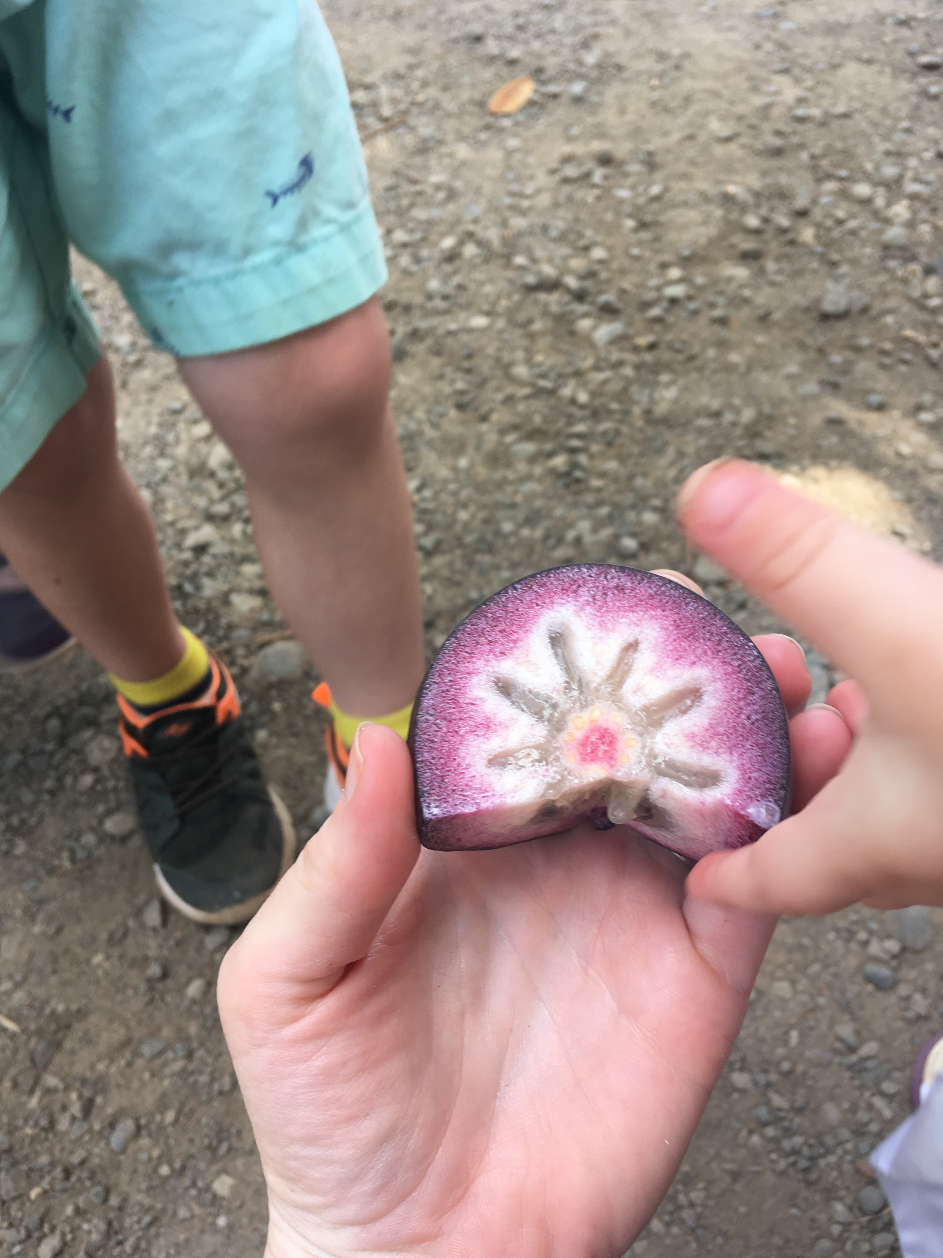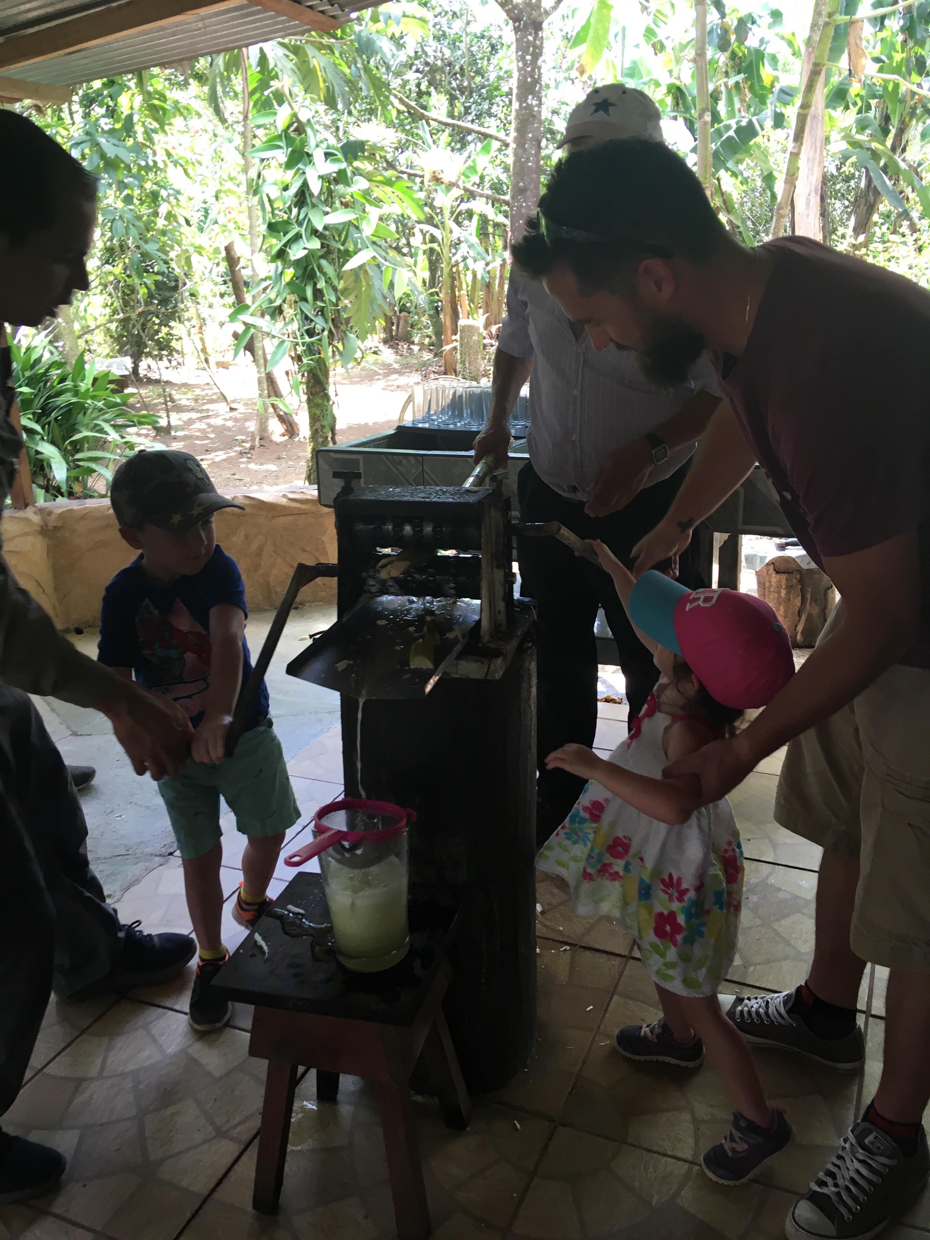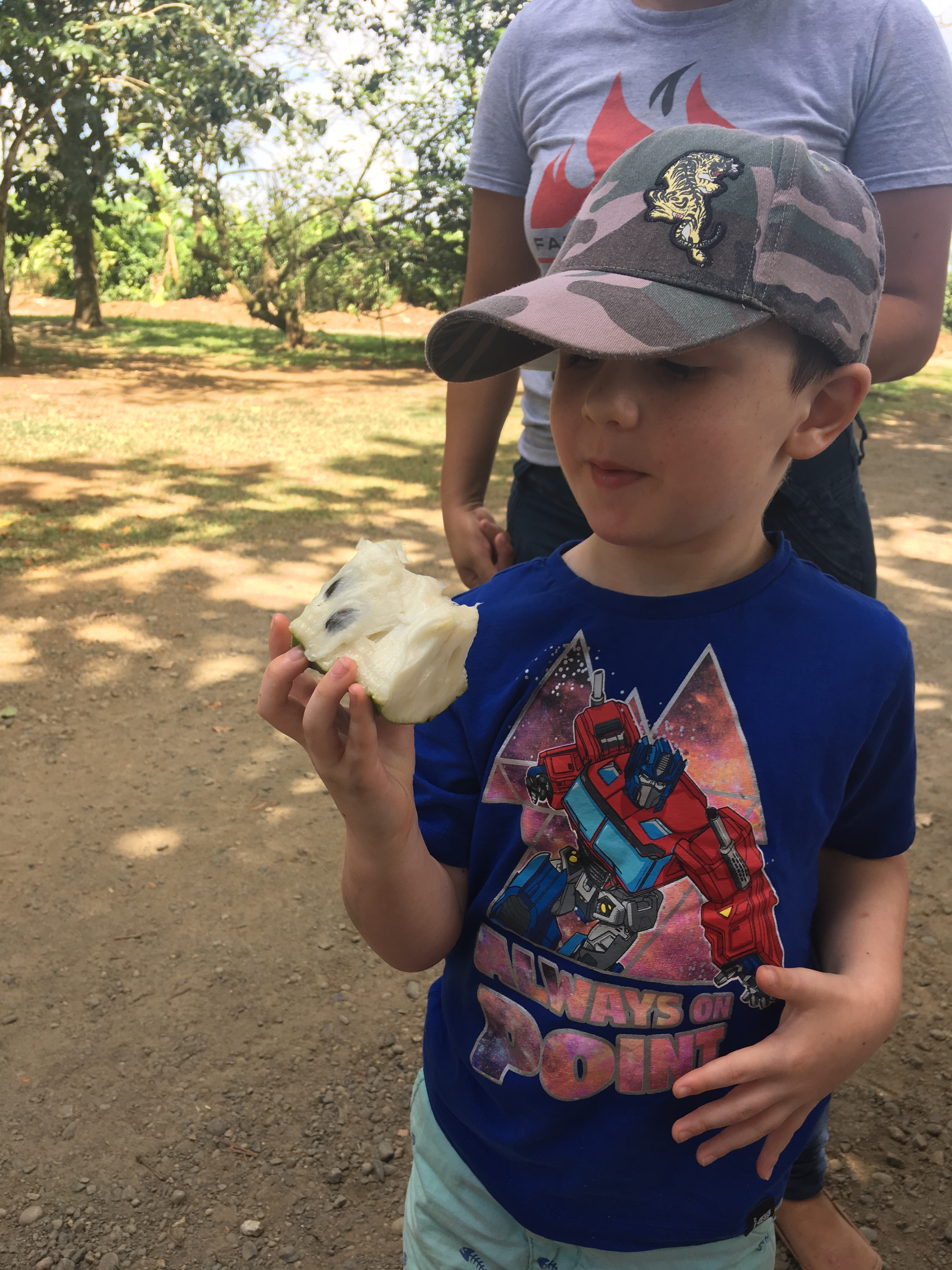 The chocolate tour did not disappoint. We were taken around the family plantation and fed all kinds of different fruit as we went along – star apples, soursop (it tastes like ice cream!) papaya, pineapple and starfruit. We saw mangoes, avocados (that grow to 2+lbs!) ginger, taro, rubber plants, bananas, breadfruit, chilies, coconuts and peppercorns. The kids got to juice a sugar cane and drink the juice.