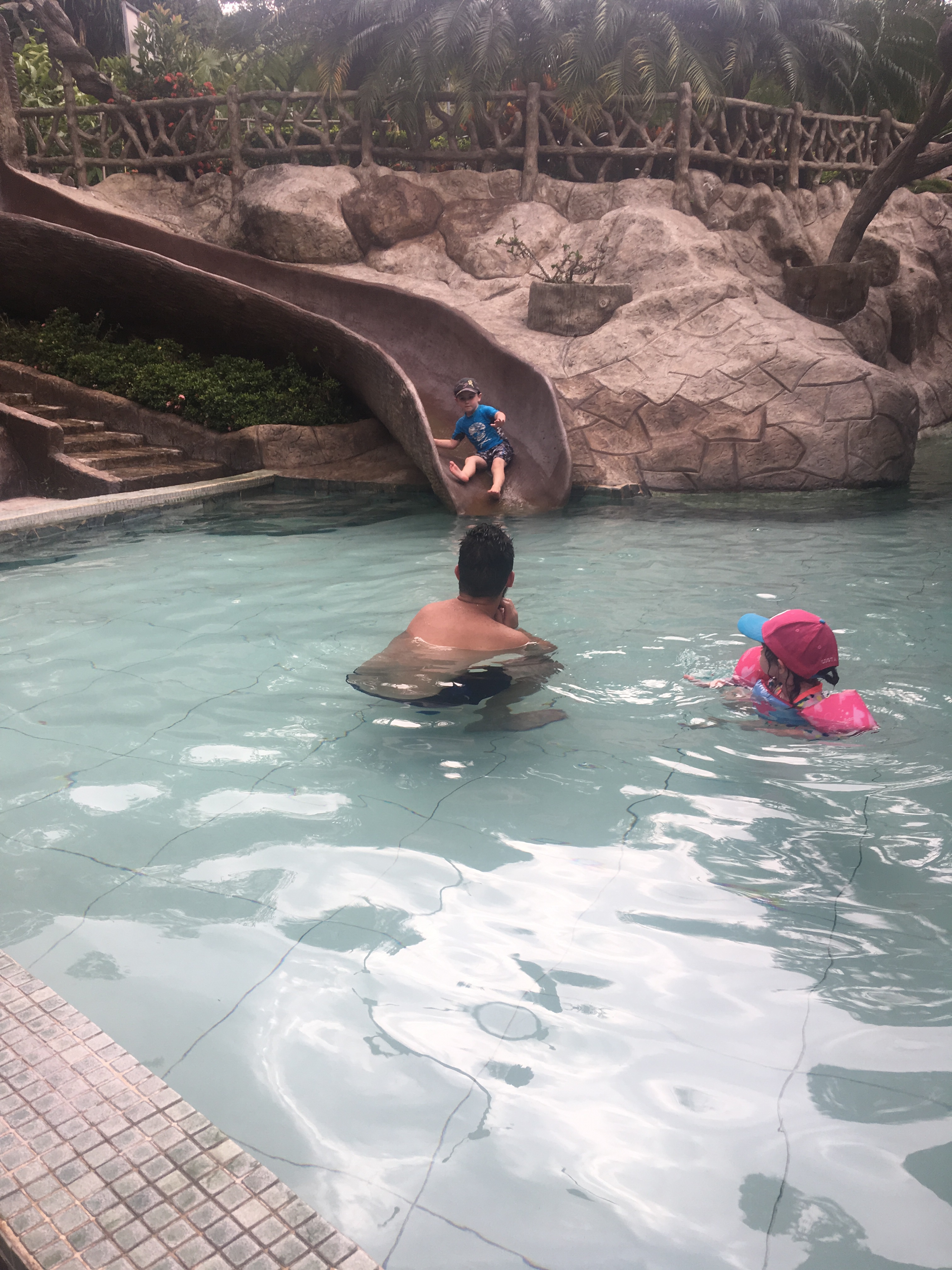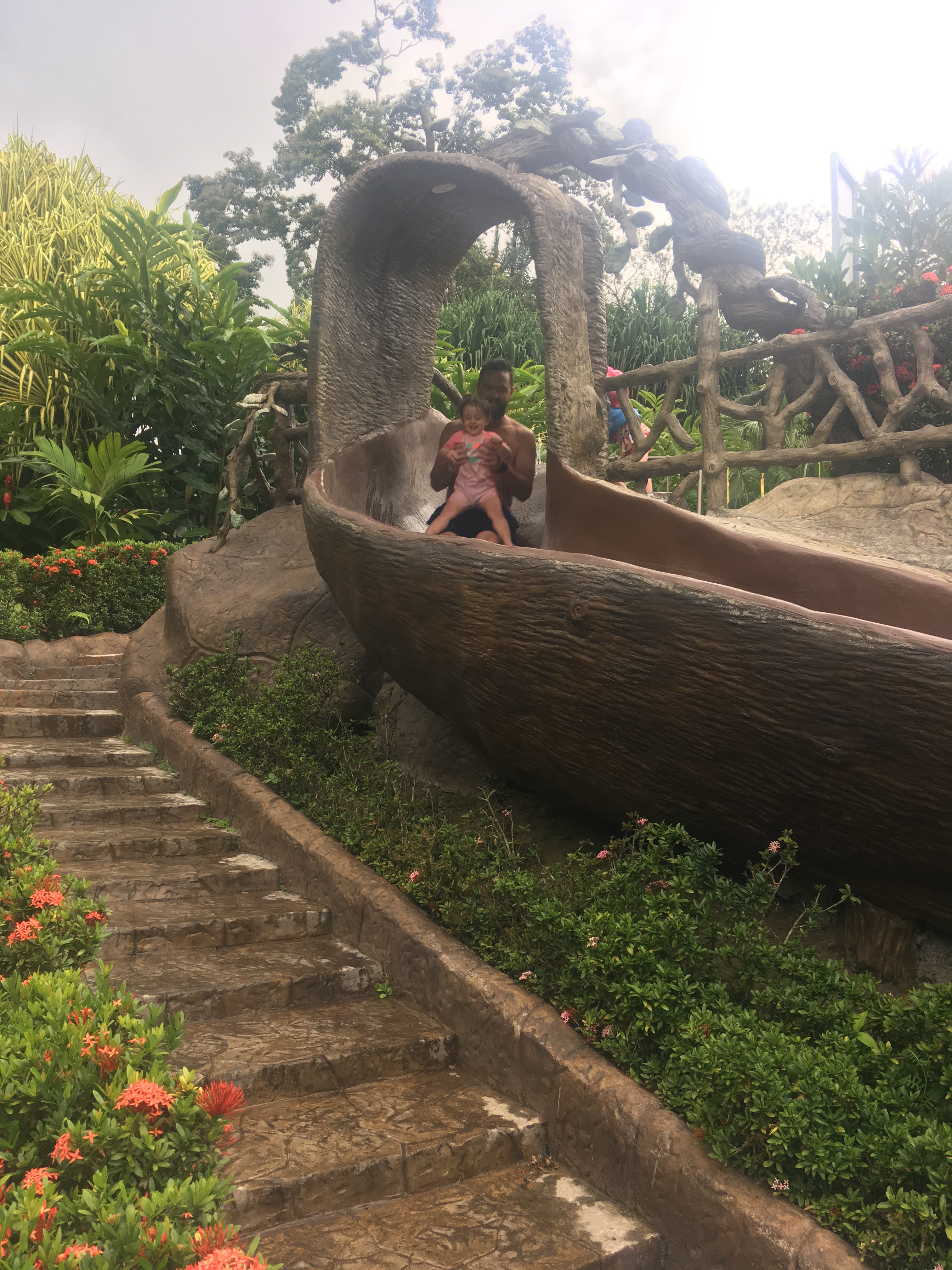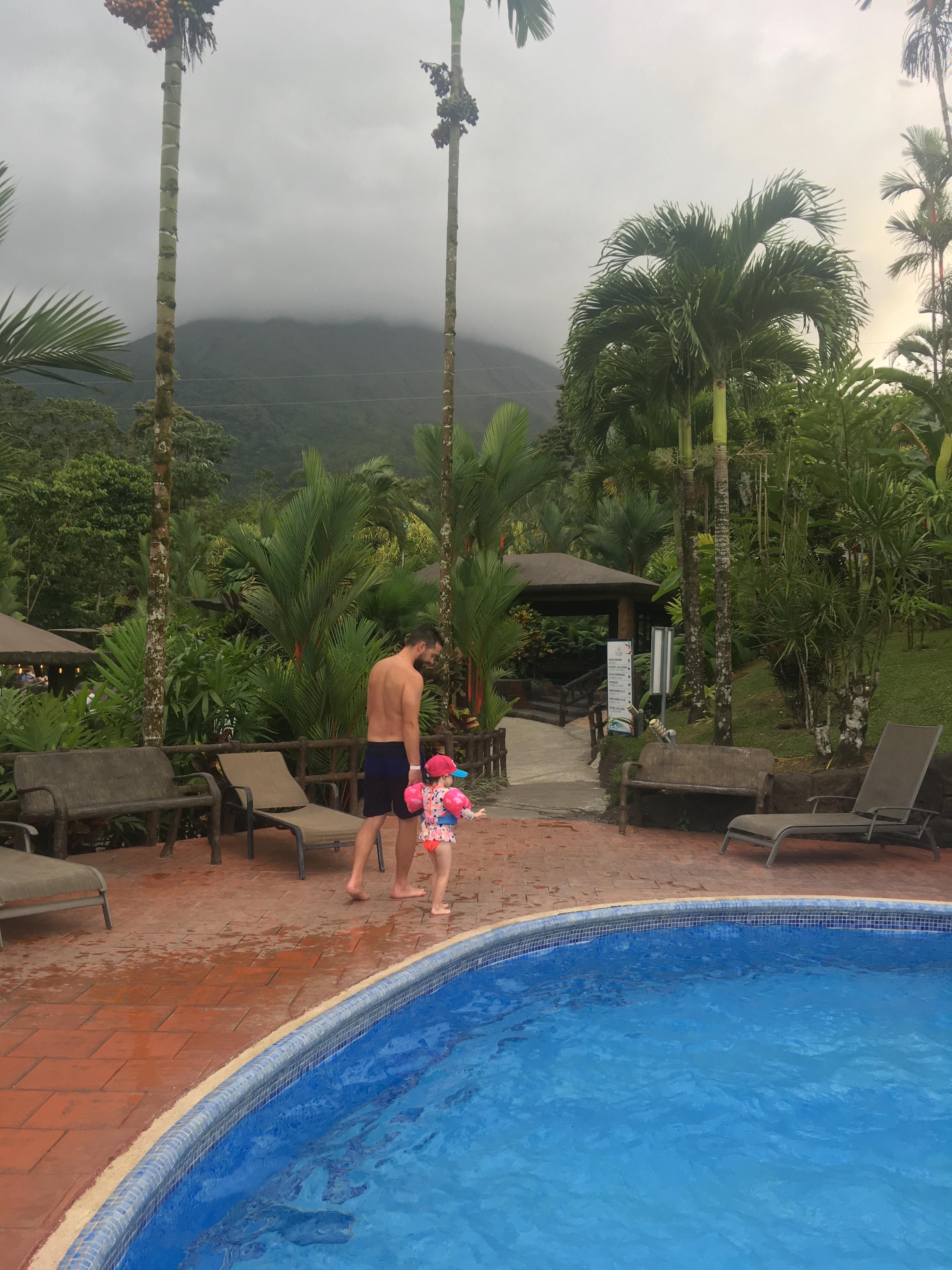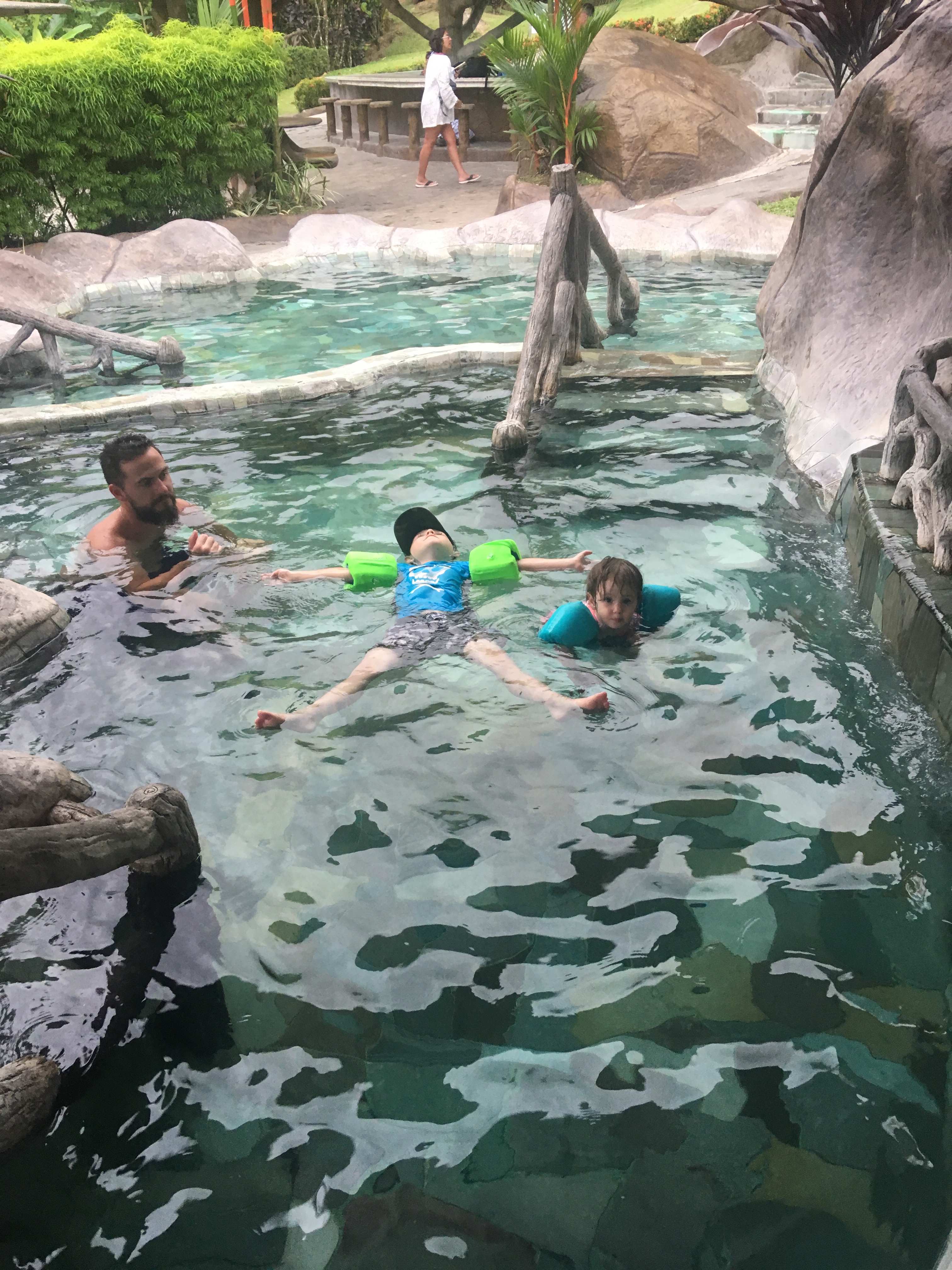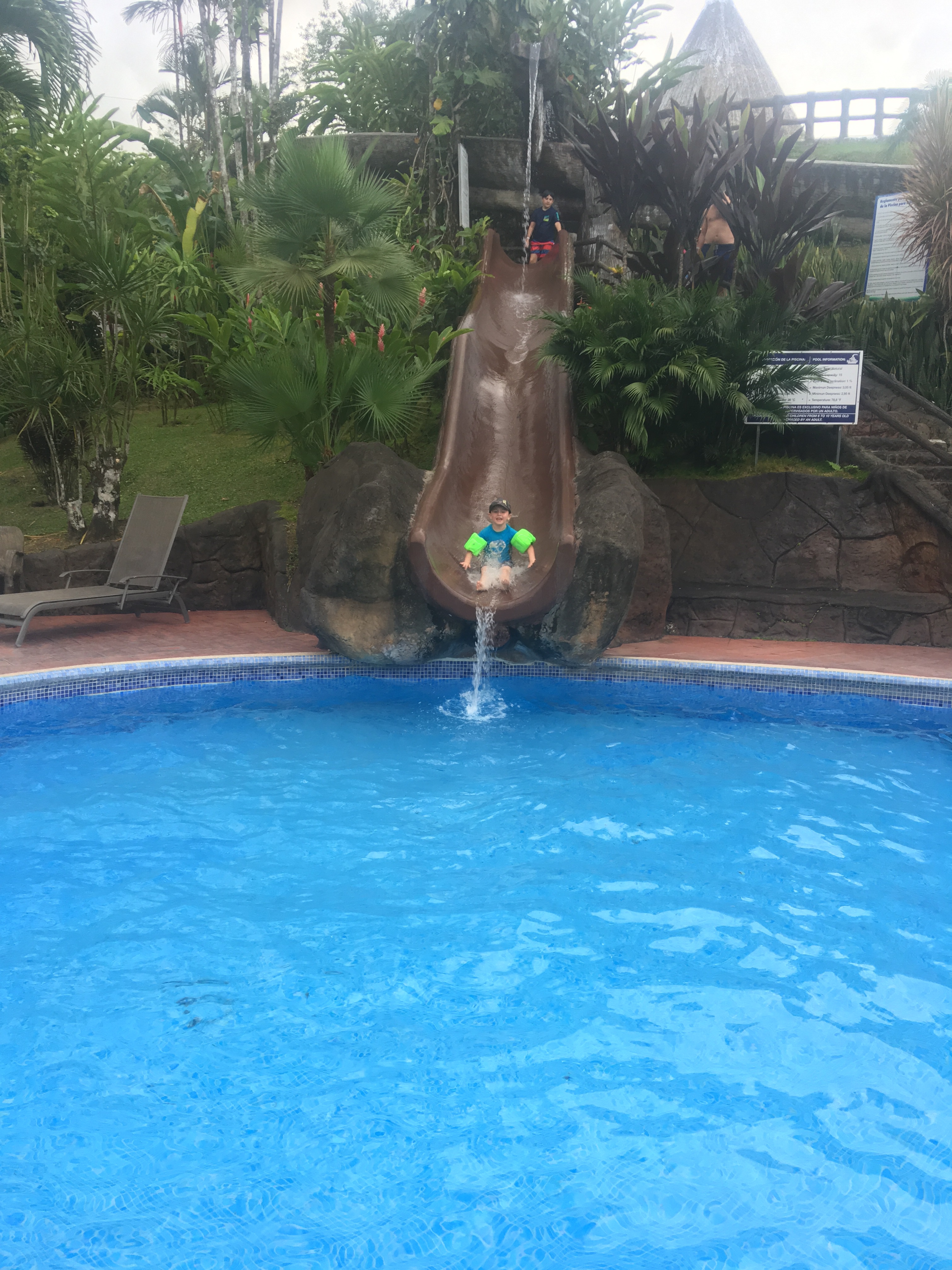 We decided for the rest of the day to visit Los Logas Resort on a day pass and relax in the natural hot springs. The heat from the volcano looming in the background makes the pools about 38 degrees. We splashed around for a few hours while Charlie enjoyed the water slides. Our day pass also got us supper so we feasted at the buffet before heading home.