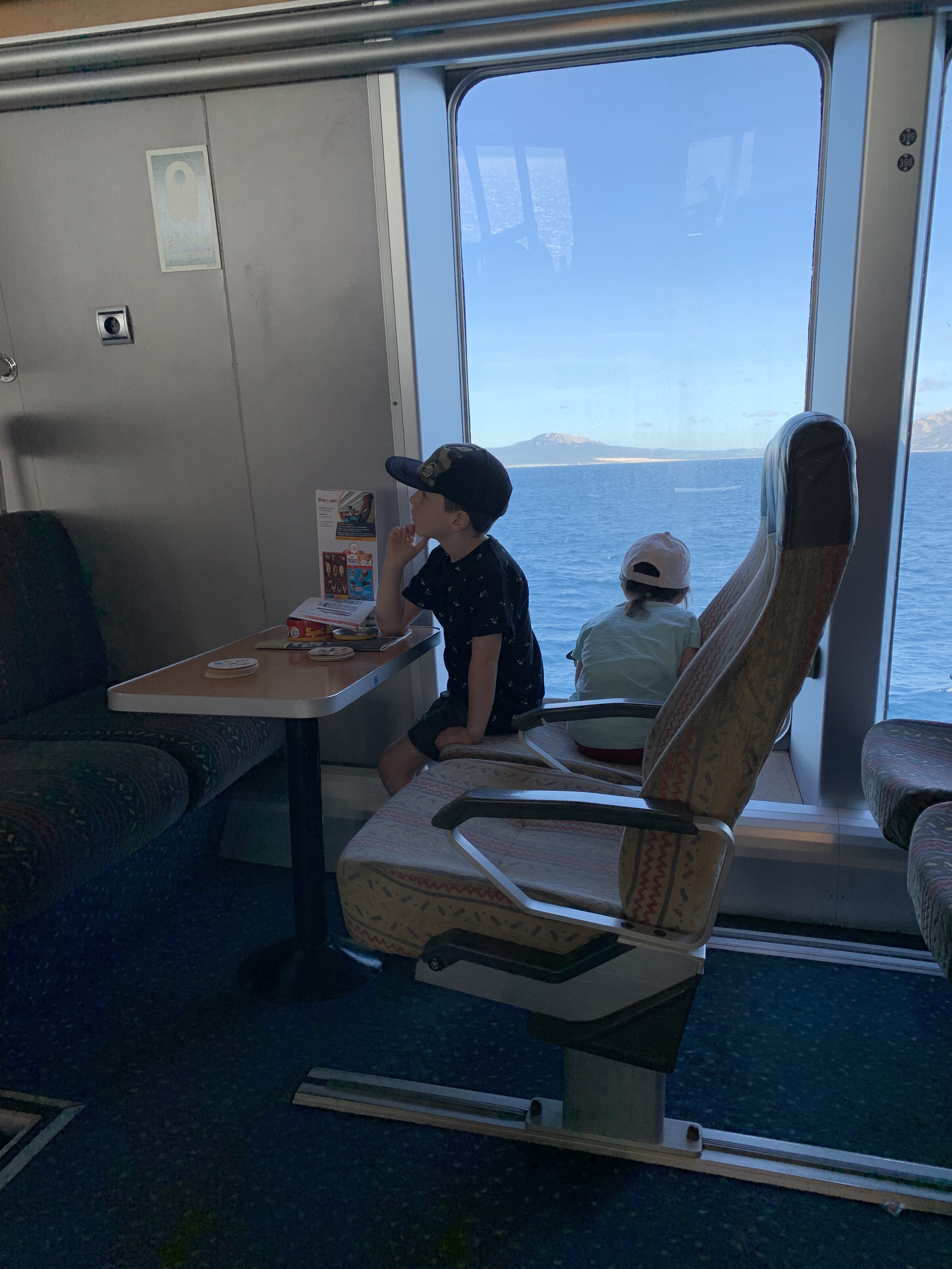 We left our place in Ferreiras uncharacteristically early. We woke the kids at 545, piled them in the car and set off for the Tarifa-Tangier ferry. The scenery was beautiful. I didn’t realize we were going to wind through hills and mountains on our way down to the Strait of Gibraltar. Nora didn’t either and since she wouldn’t give up her phone ended up getting carsick in the last fifteen minutes. It’s not a family road trip without a little carsickness!