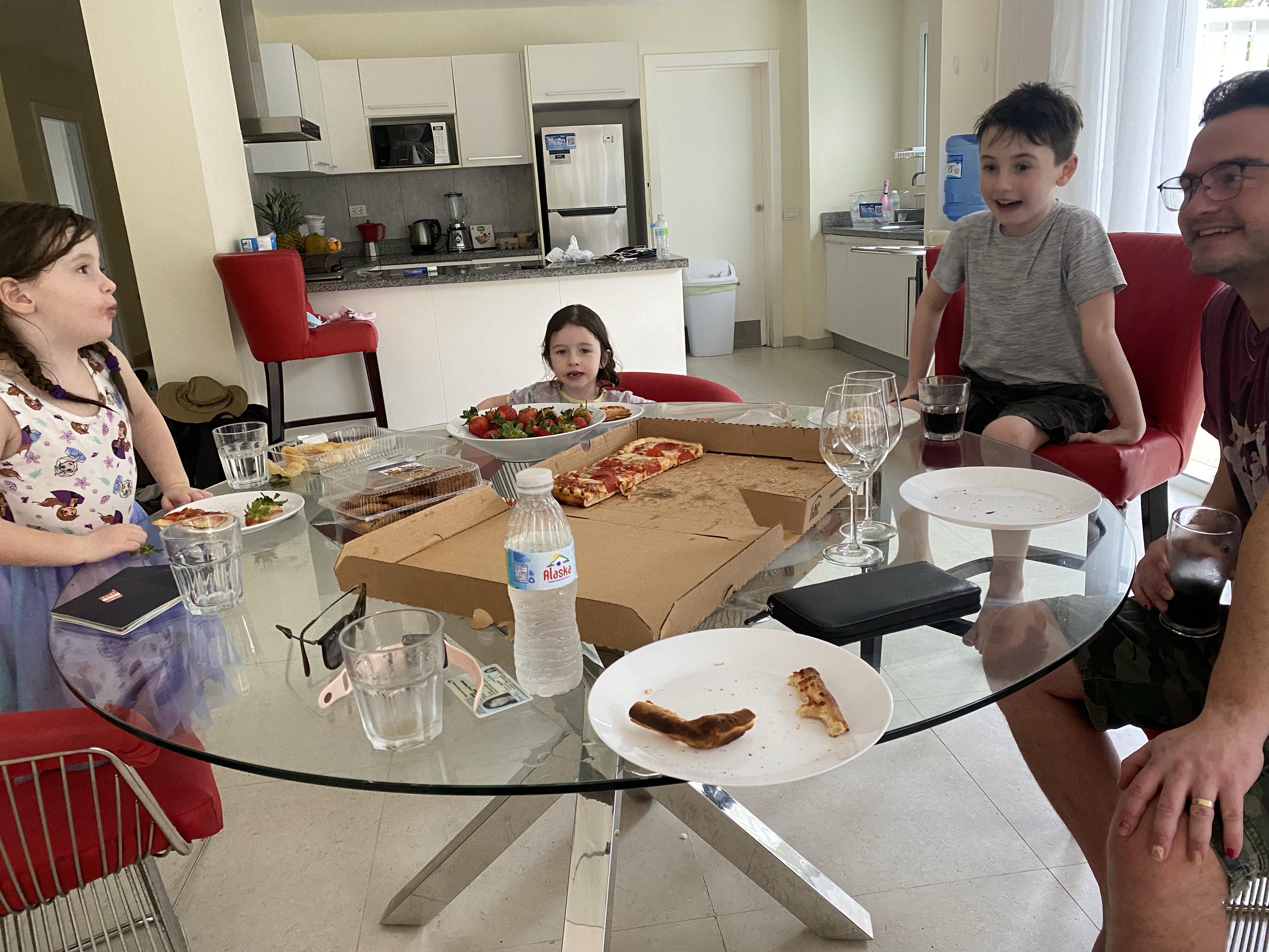 After we landed everyone was pretty tired and rather hot. Nothing like a 60 degree temperature increase in an N95 to make you sweaty. We caught our transfer to our house, which completely lived up to expectations, the kids went for a swim. We ordered in pizza went for a quick tour of the beach and called it a day.