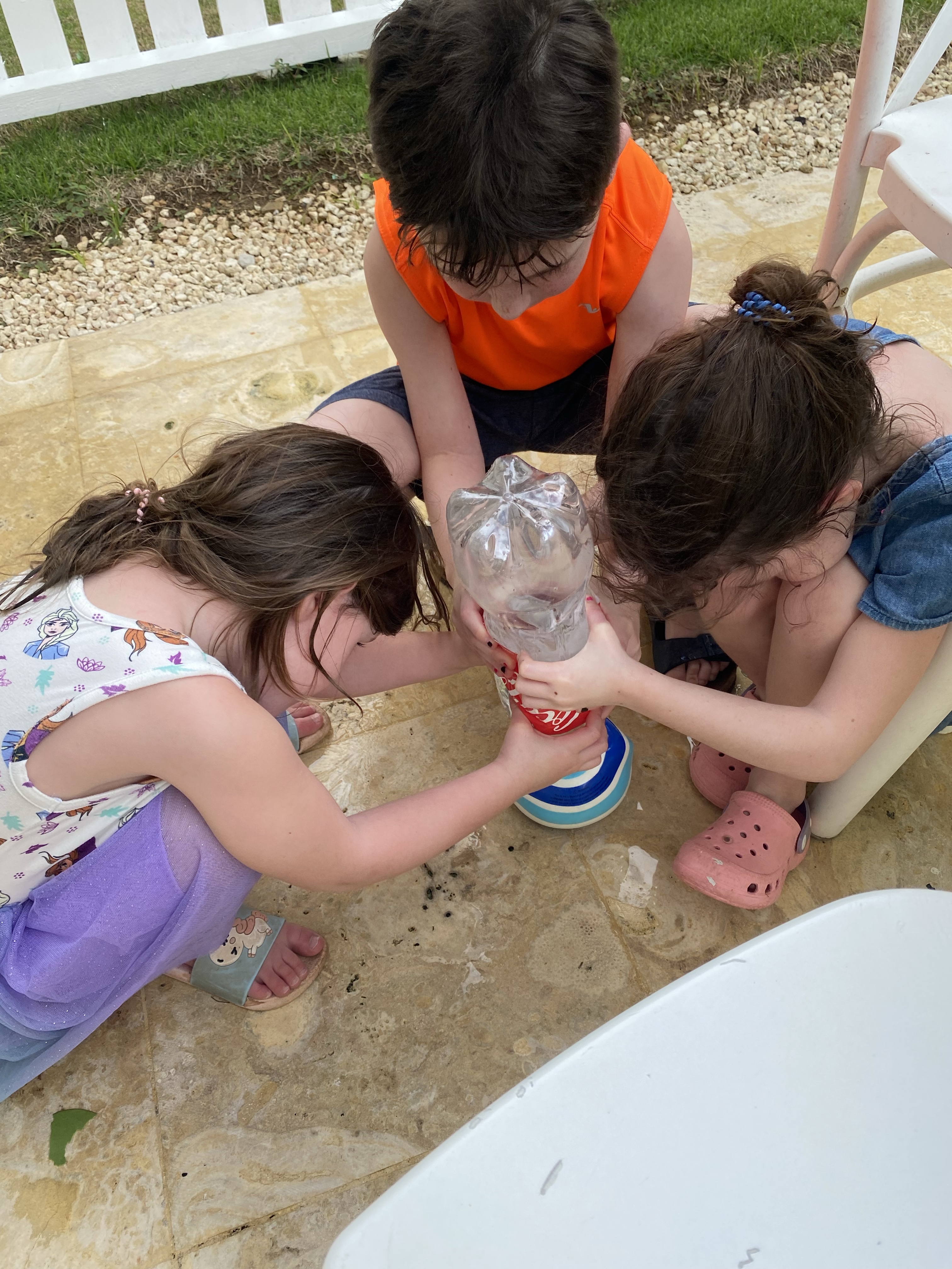 After we finished off our studies Jacob headed out to the grocery store with a very long list and a time limit. He managed to overflow one cart worth before he ran out of time. The kids and I played in the pool, had lunch and sunbathed. We also fashioned a water pump out of a coke bottle, a ball needle and a leaf to make it water tight. That counts as science right?