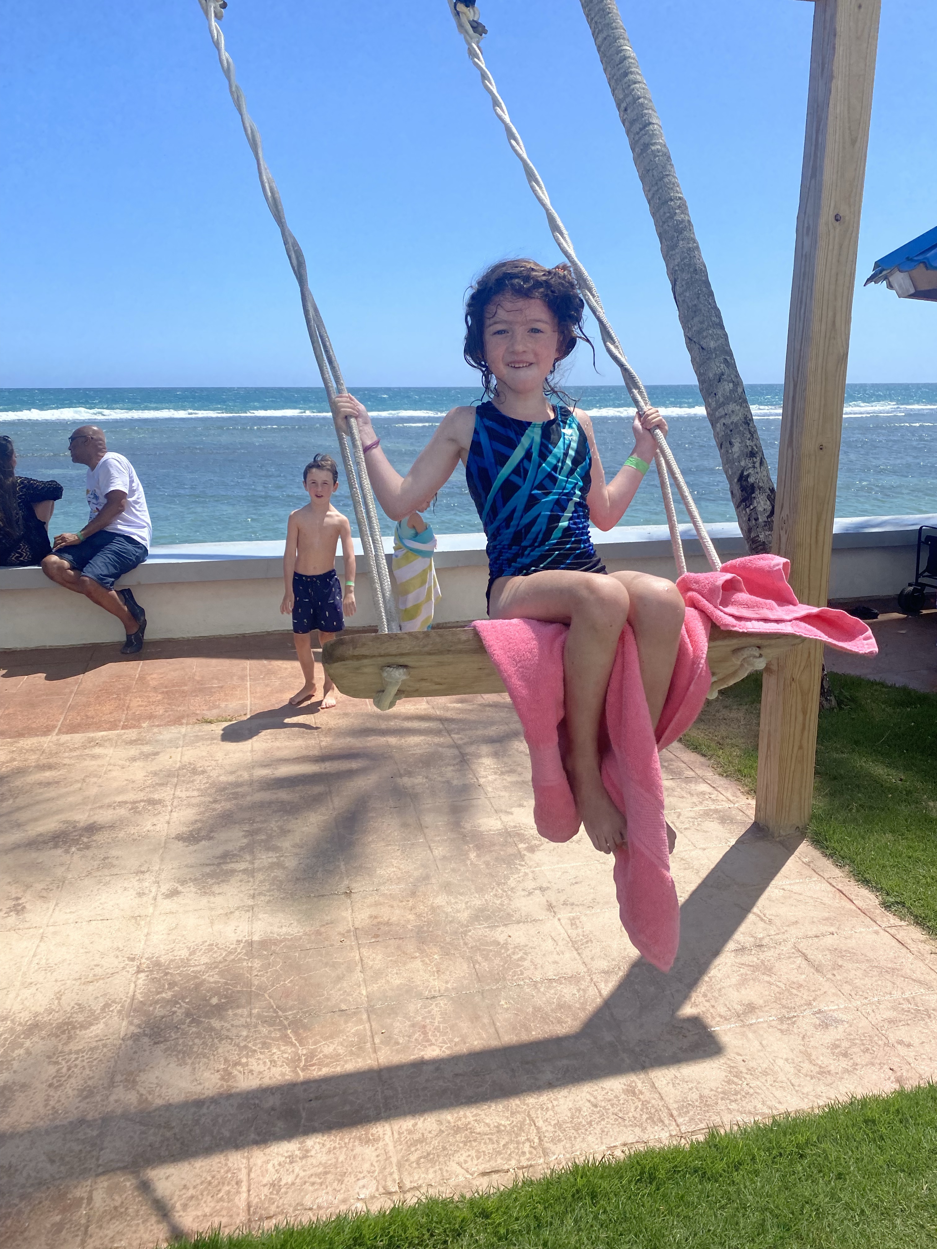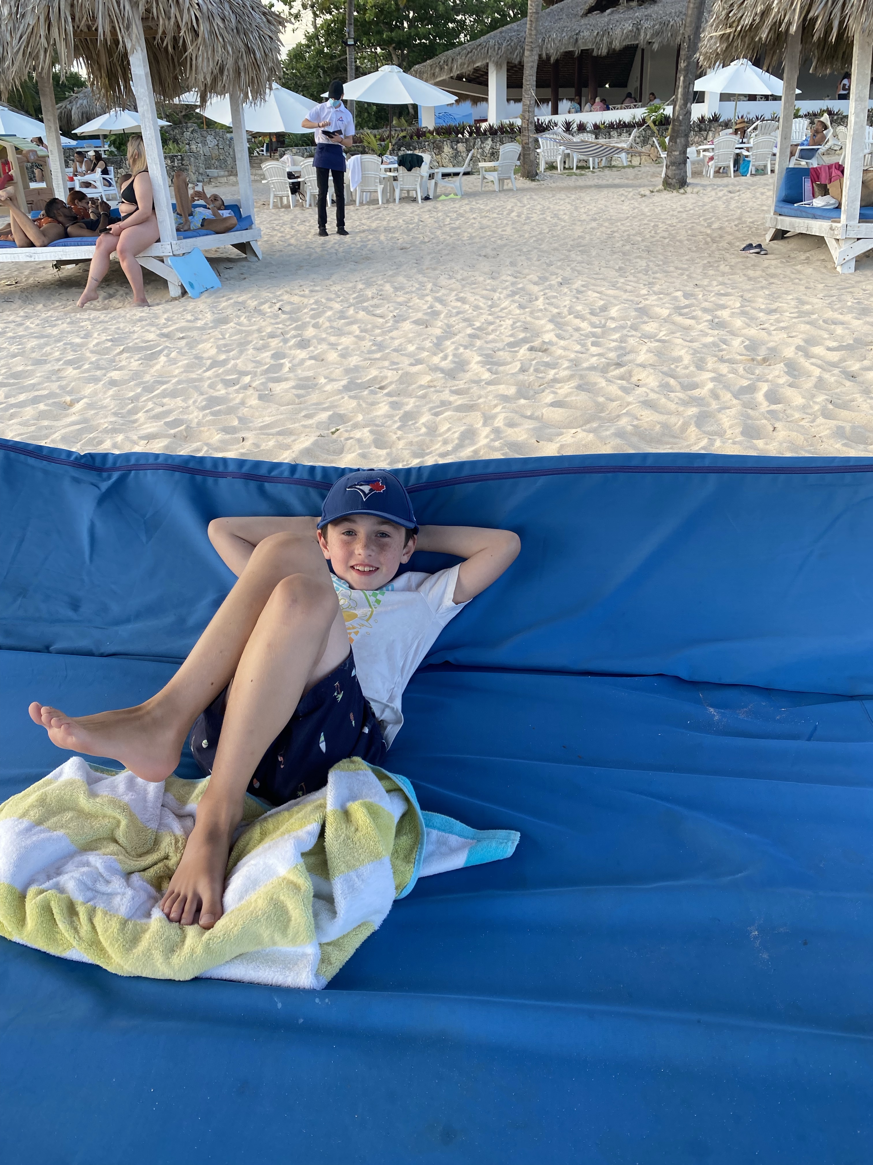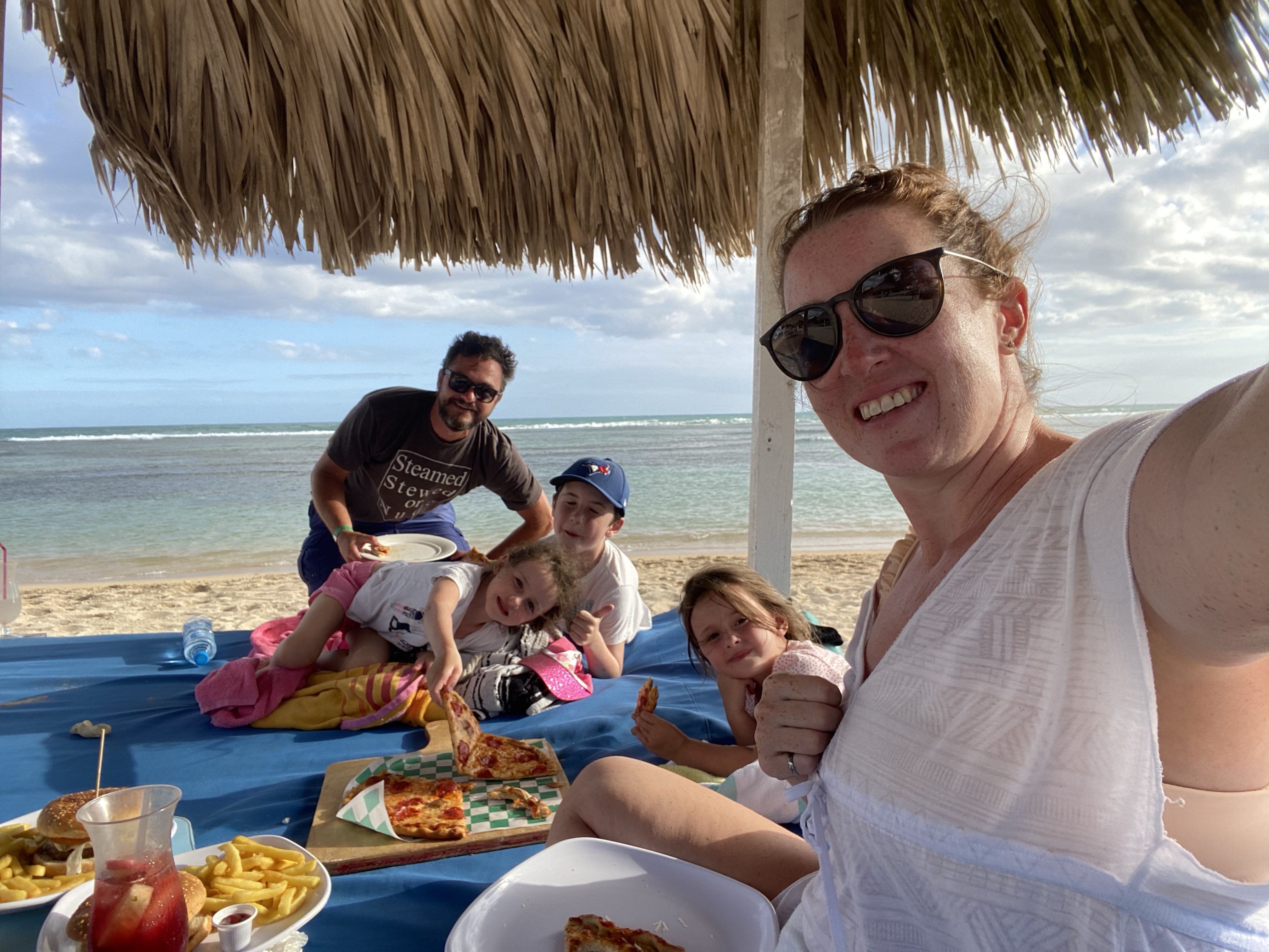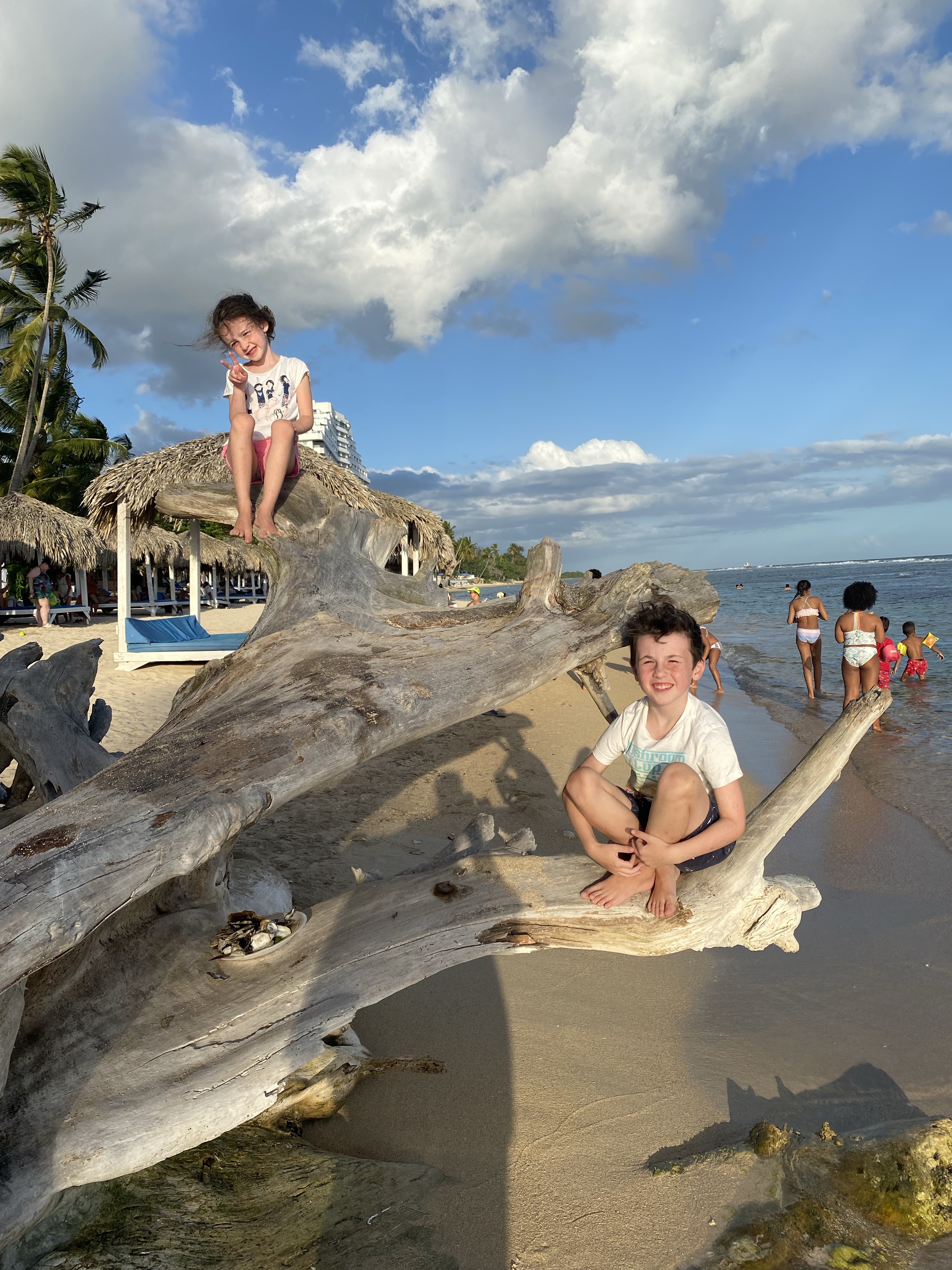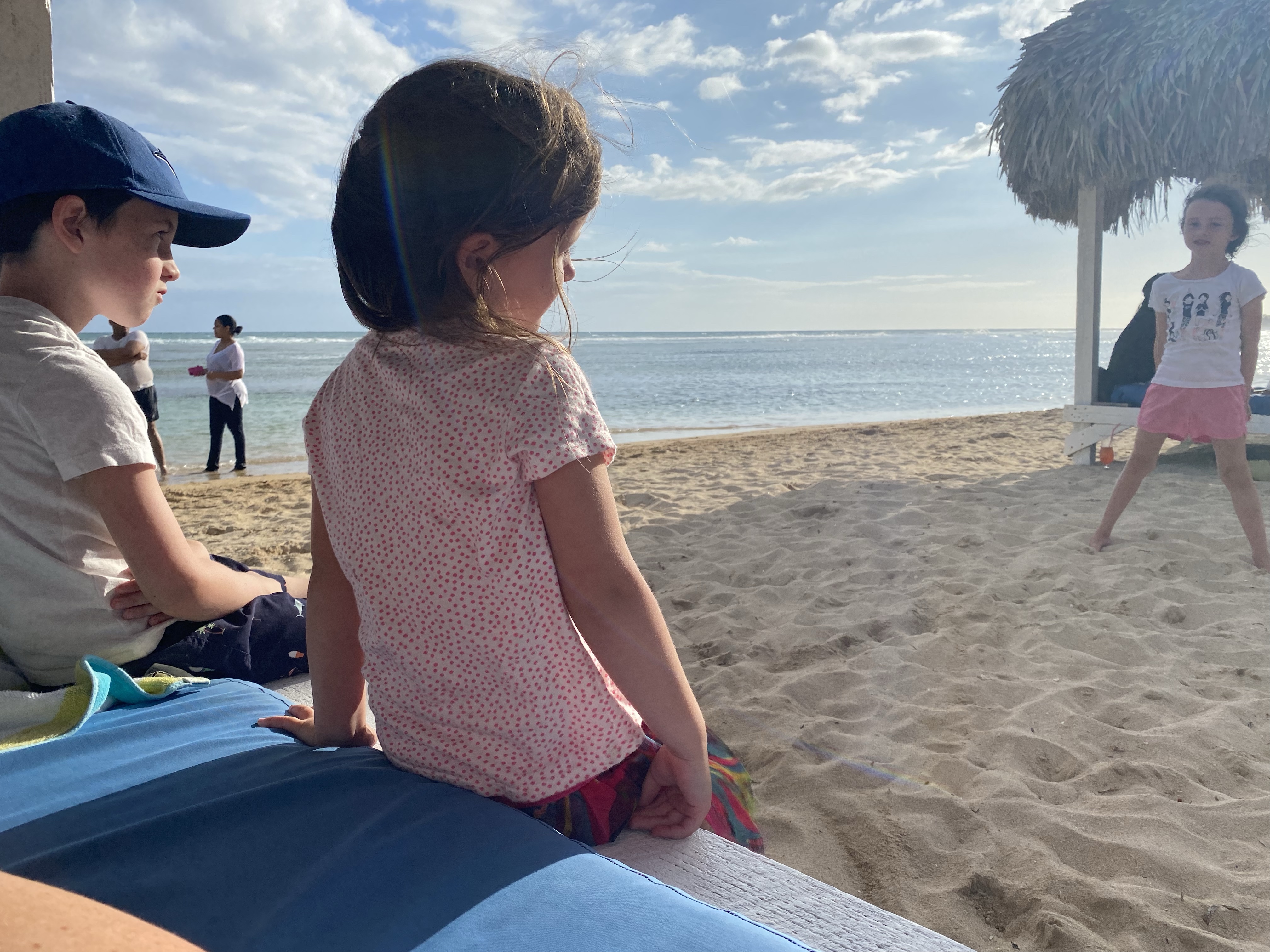 The next day we spent much the same way, aside from Jacob having to travel to the stupid COVID testing clinic to get Mads cleared to fly. They both headed there first thing in the morning to have the test done and then unfortunately, Jacob had to travel back an hour later to collect the results. When we finally got the All Clear to fly we celebrated by heading to the next beach restaurant and booked a cabana to spend the day. It was a great way to spend our last day in Dominican. The kids all had fun in the very warm shallow water, Madeline and Nora made art in the sand. They all found a new fallen log to climb all over. Jacob and I laid in the cabana with our sangria. All in all a pretty fantastic end to 6 weeks of sunshine in the DR.