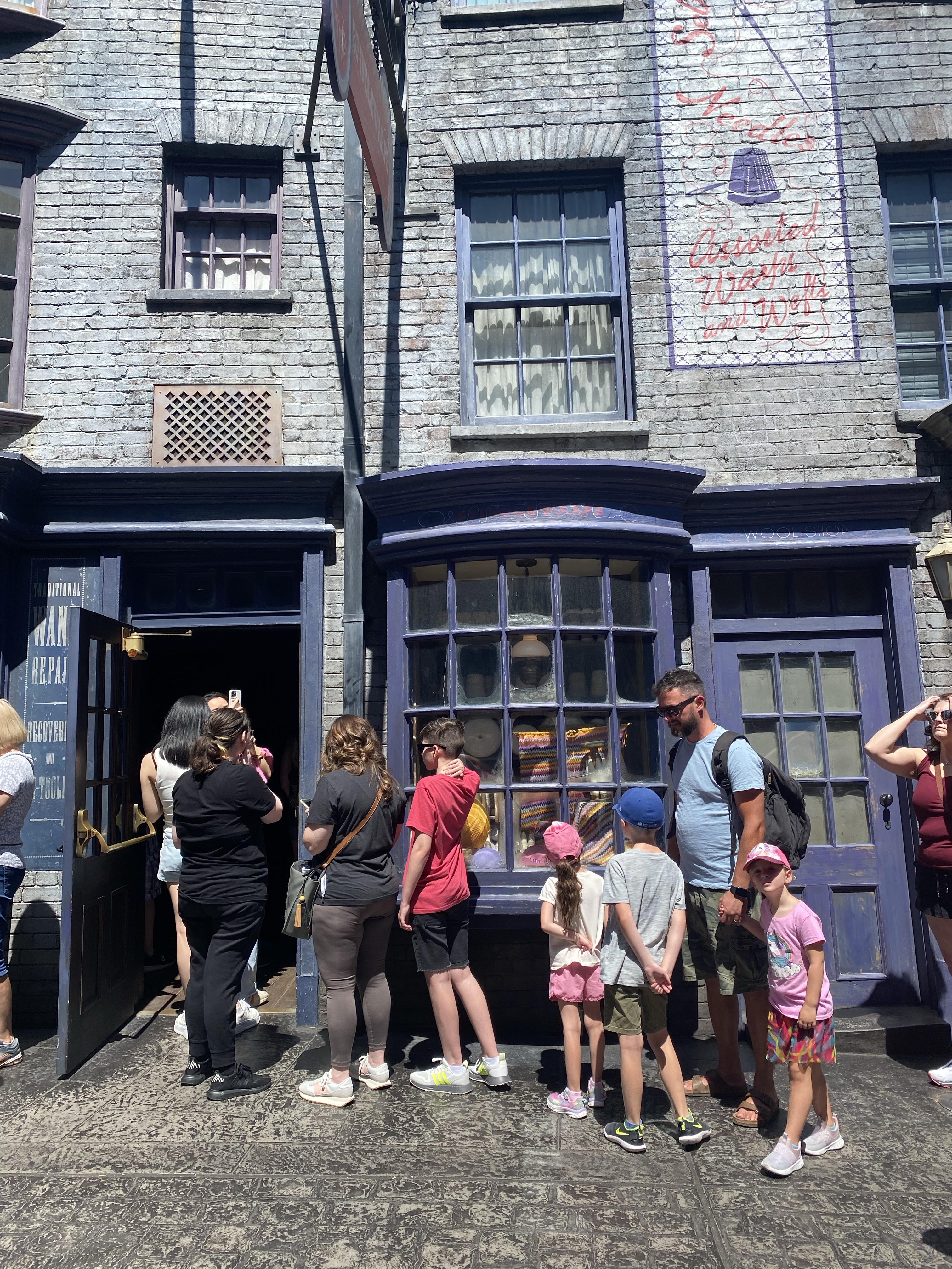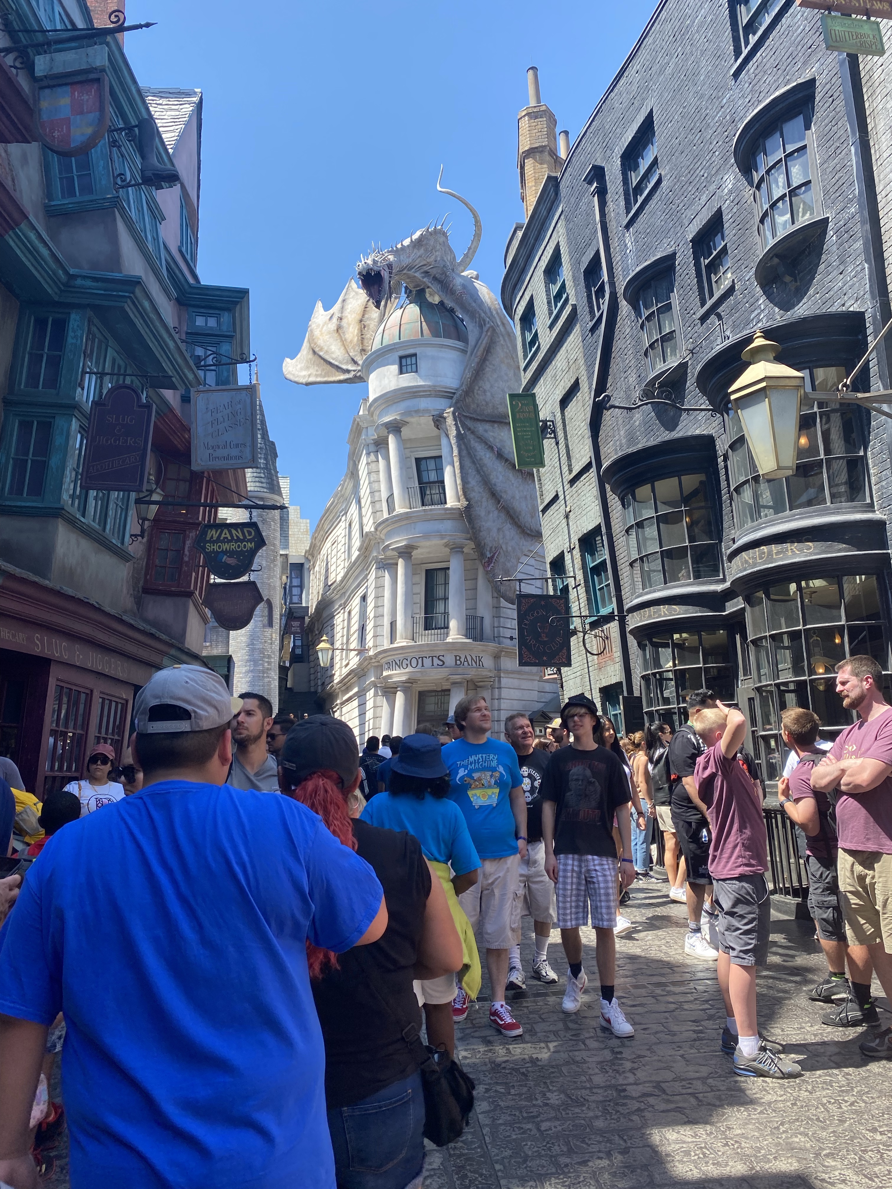 After lunch we headed into Diagon Alley. There was so much to see and so many people that it honestly was just hard to take in. We wandered through Weasleys Wizarding Wheezes, headed to Ollivanders to get our wand and then watched the dragon on top of gringotts breathe fire before heading into the bowels of the bank to help Harry Ron and Hermoine escape. As a reward for our successful mission we stopped and had our first taste of butter beer before catching the hogwarts express to hogsmeade.