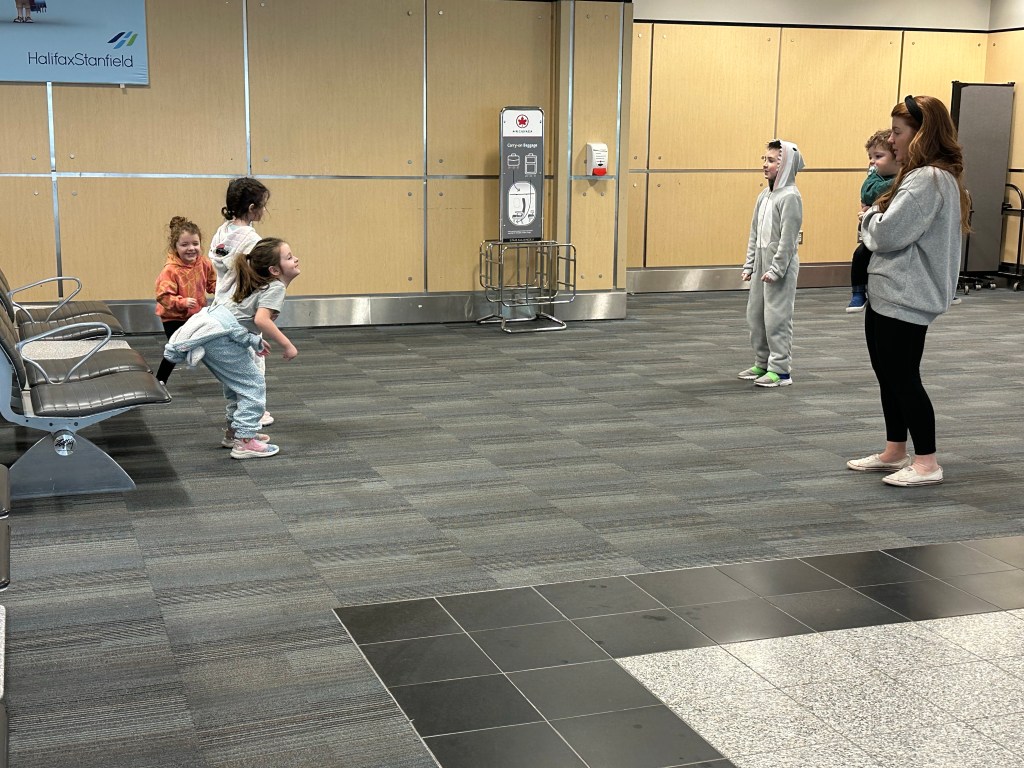 We all piled in the van Tuesday morning so that Jacob could drive us to the airport. We had originally hoped he would be able to join us for at least part of the trip, but that hasn’t worked out. With three kids in the third row, two kids and Kayla in the middle, Jacob and I up front we hit the road. We managed to make it to Halifax with only one short pit stop without any major meltdowns – rather impressive if you ask me. We grabbed a quick bite at Jack Astor’s and then let the kids burn some energy at hop!skip!jump! Before we settled into the airport hotel for the night.