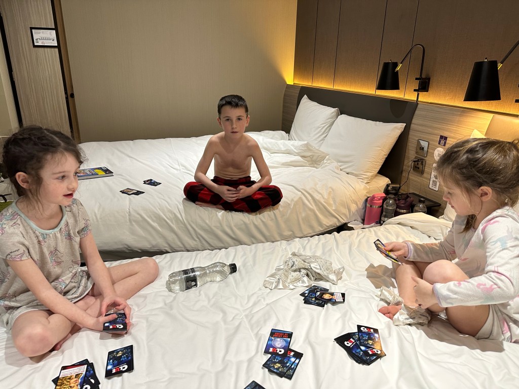 We grabbed a quick supper and checked in to our airport hotel for the night. The kids were a bit loopy after a day of travelling so we after quickly discovering why late night cable tv is not a good idea, we played a game of Clue and went to sleep.