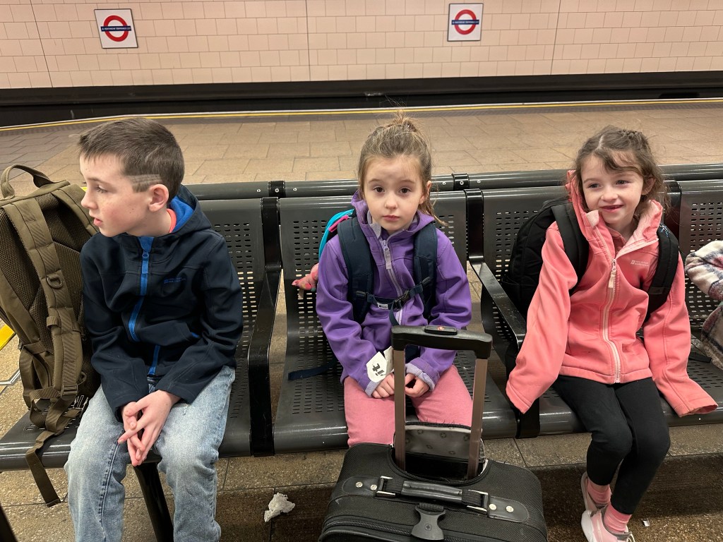 Jacob dropped us at the airport Wednesday morning and Kayla and I set out with the kiddos. We killed a couple of hours with the kids running around the airport and then boarded a very empty (thank goodness) flight. The kids all did really well on the 6 hour journey, turns out all that travel training has paid off. Kayla and I mostly kept our cool. We travelled carry-on only so managing the bags was a little bit hectic. Seems worth the hassle since Air Canada managed to lose 1 of the 2 pieces of the stroller that we gate checked. After we cleared security and walked the 3,000 miles across Heathrow airport we almost literally ran right into Adam. Ev and Archer were especially glad to track down Dad.