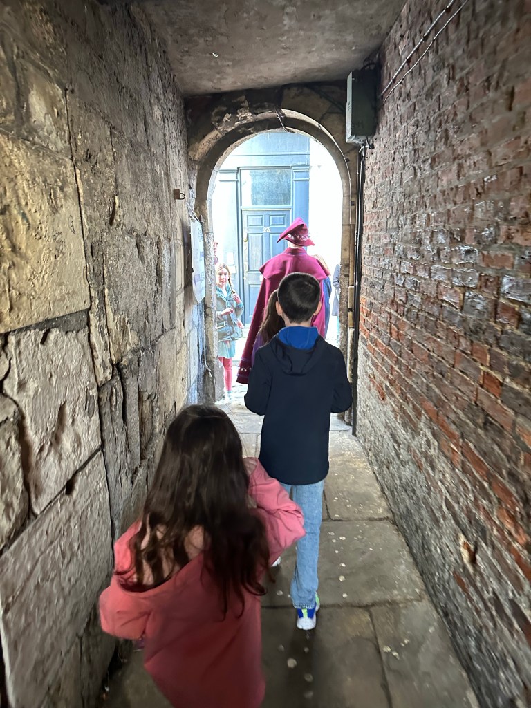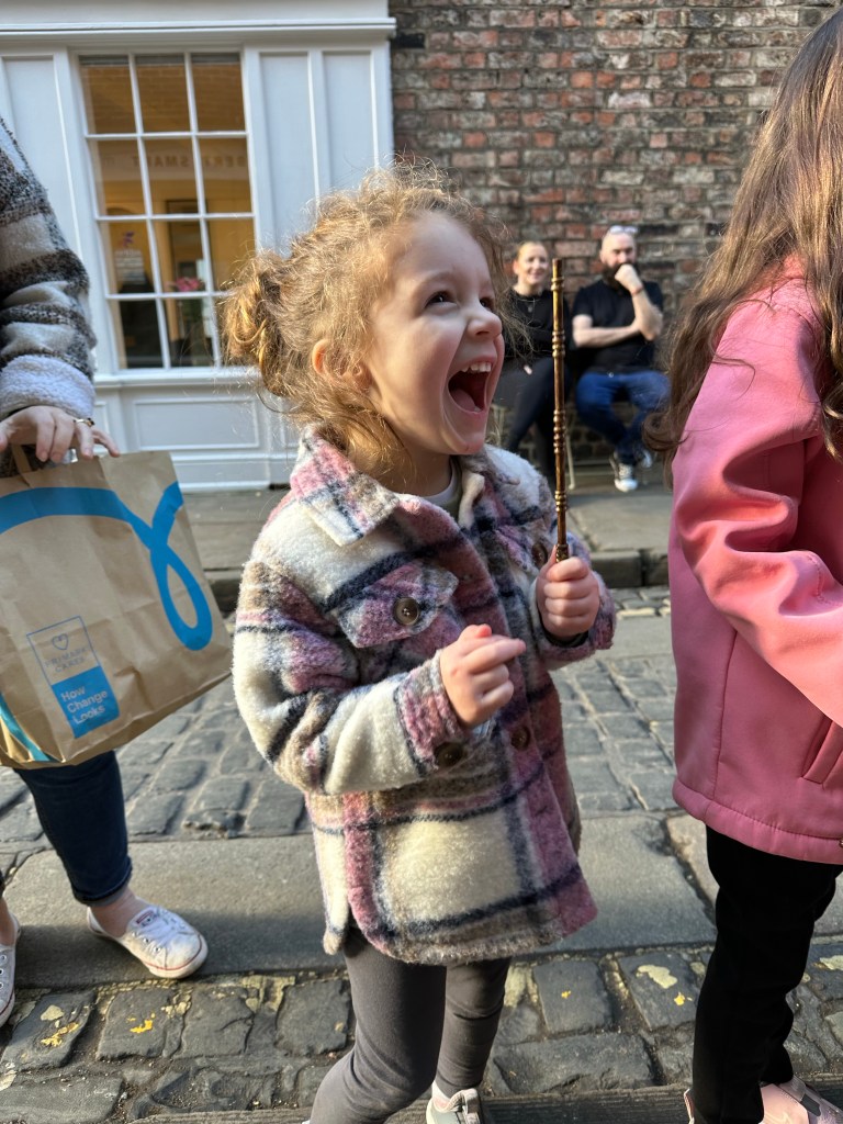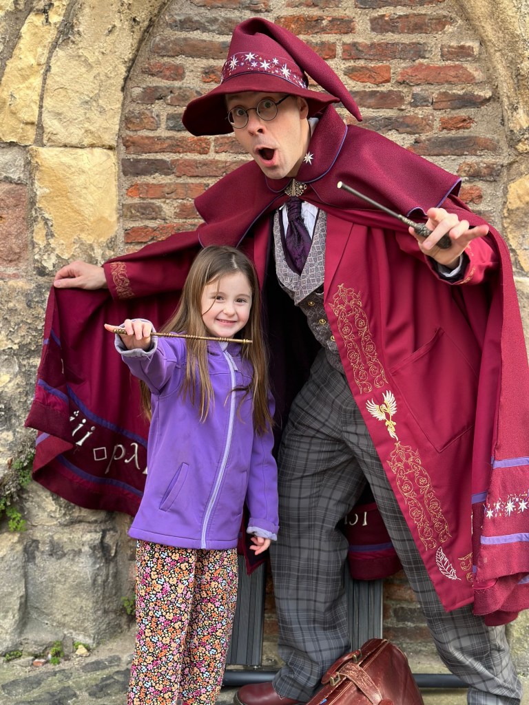 We headed in to city centre for the start of the tour with Kayla and Evelyn. Evs was already excited by the bus so her day was off to a great start. We grabbed a quick bite to eat and a coffee and found the meeting spot for the tour with a few minutes to spare. The kids were beginning to get impatient when our tour guide came strolling down the shambles. Any concerns we had about not being able to find the tour were relieved as he was dressed head to toe in purple wizarding robes, compete with hat, wand, carrying bag and stepping stool. The kids were pumped.
