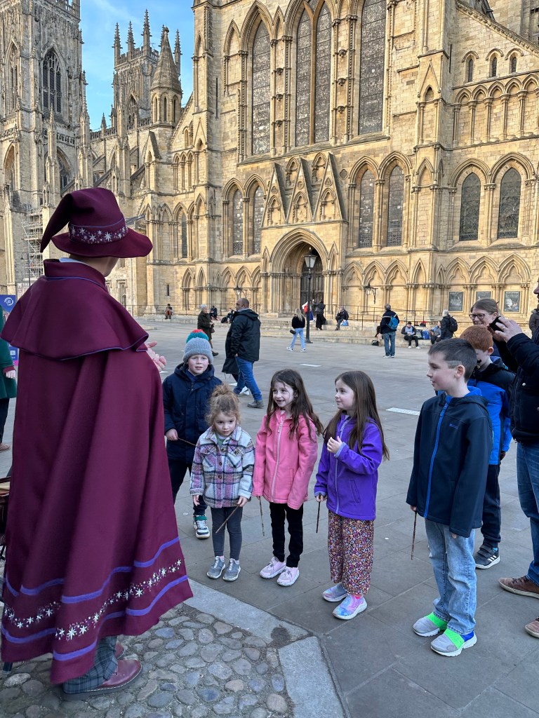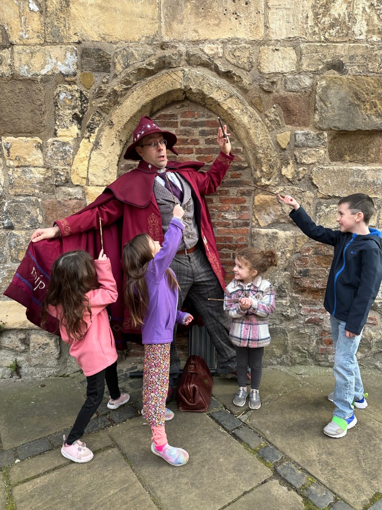 The tour lasted about an hour and was so well done. We walked around the shambles, down little alleyways, around the minster and back around to city centre. We made about half a dozen stops where he pointed out different parts of the city or buildings all while doing a magic trick. He stayed in character the whole time and was so engaging with the kids. He had them laughing and following along for the full hour. At the end of the tour we had our pictures taken with the kids new favourite wizard and then wrapped up the kids day and headed for home.