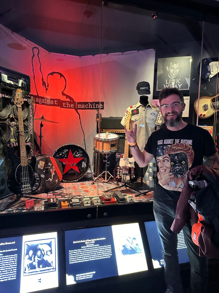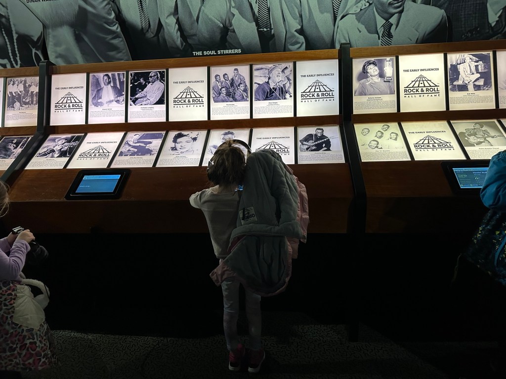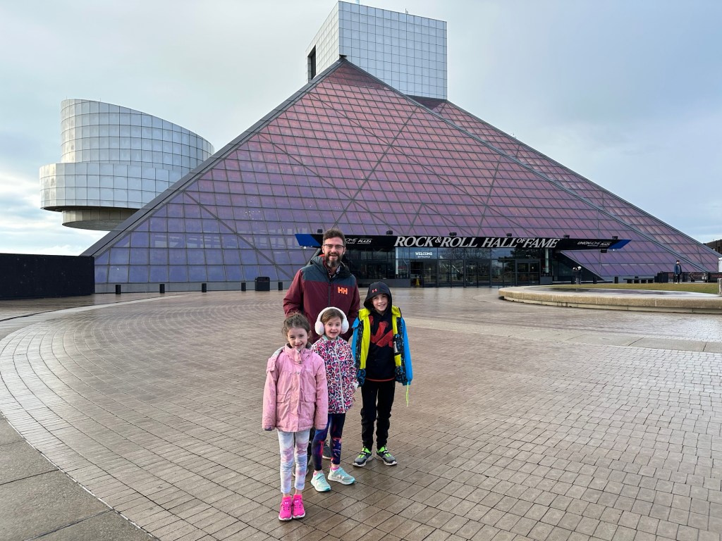 The rock hall of fame was definitely with the couple of hours that we were there, but really that was enough time for us. It felt a lot like a huge Hard Rock Cafe. I truthfully liked the building itself more than the exhibits but I’m not nearly the audiophile that Jacob is. The kids liked any of the exhibits where they got to play on a screen.