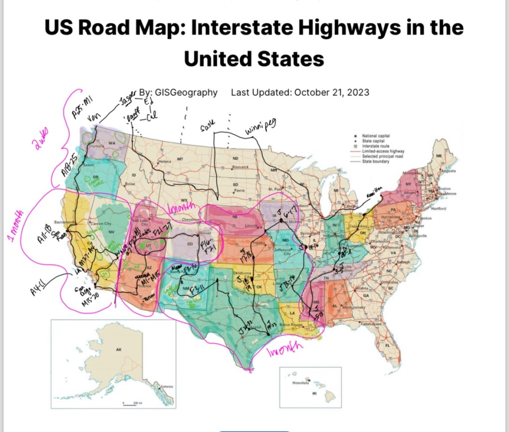 We have come up with at least a general route that we will take and more or less a timeline of how to accomplish it. Some parts will be slower than others as I am still working but the plan is to spend as much time as possible in as warm of a place as possible. At the moment we have accommodations for most nights until January 23rd.