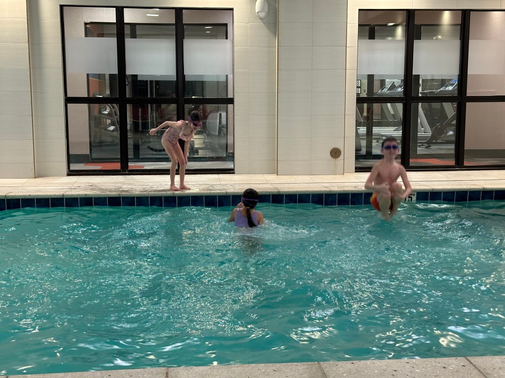We decided to stop for the night just outside of Cincinnati. The previous night in the Super 8 was about as successful and luxurious as one would imagine we thought we would upgrade to a Hampton Inn, with a pool. We checked in, let the kids blow off a little steam, I got some work done, grabbed some supper and attempted to get some rest. In hotels we have one girls bed and one boys bed, and unfortunately for me, there are more girls than boys so it makes for a tight squeeze. At around 3am, I gave up, put Madeline on the floor switched sides on the bed, again, and got a few hours sleep. Luckily we have a 3 bedroom house waiting for us in Louisville.