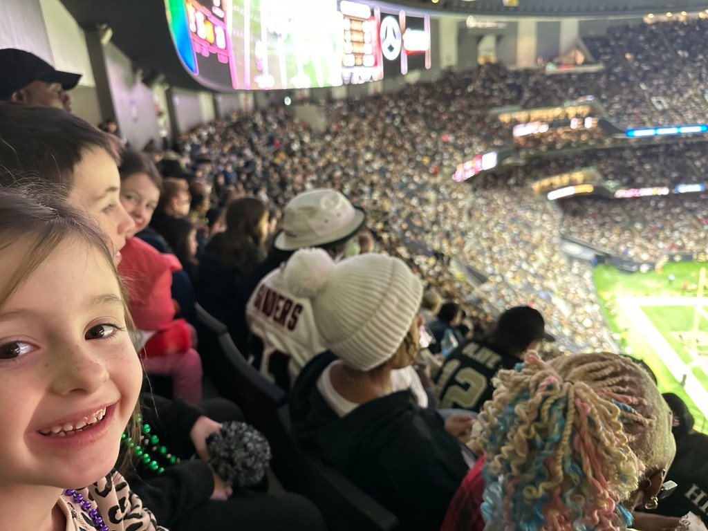 The game itself was a ton of fun. The kids were super into it. Nora asked about 631 questions on how football worked and why there was so much chanting. They made a solid effort to make it onto the jumbotron but I would assume the cameras can’t shoot that high up in the crowd. Saints won the game 48-17 and we all had a blast.