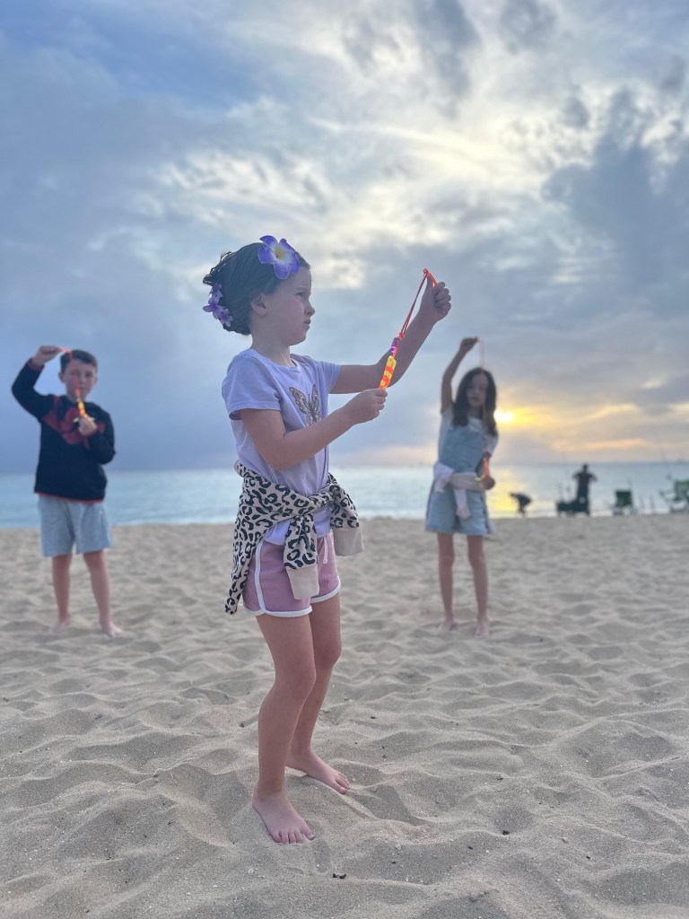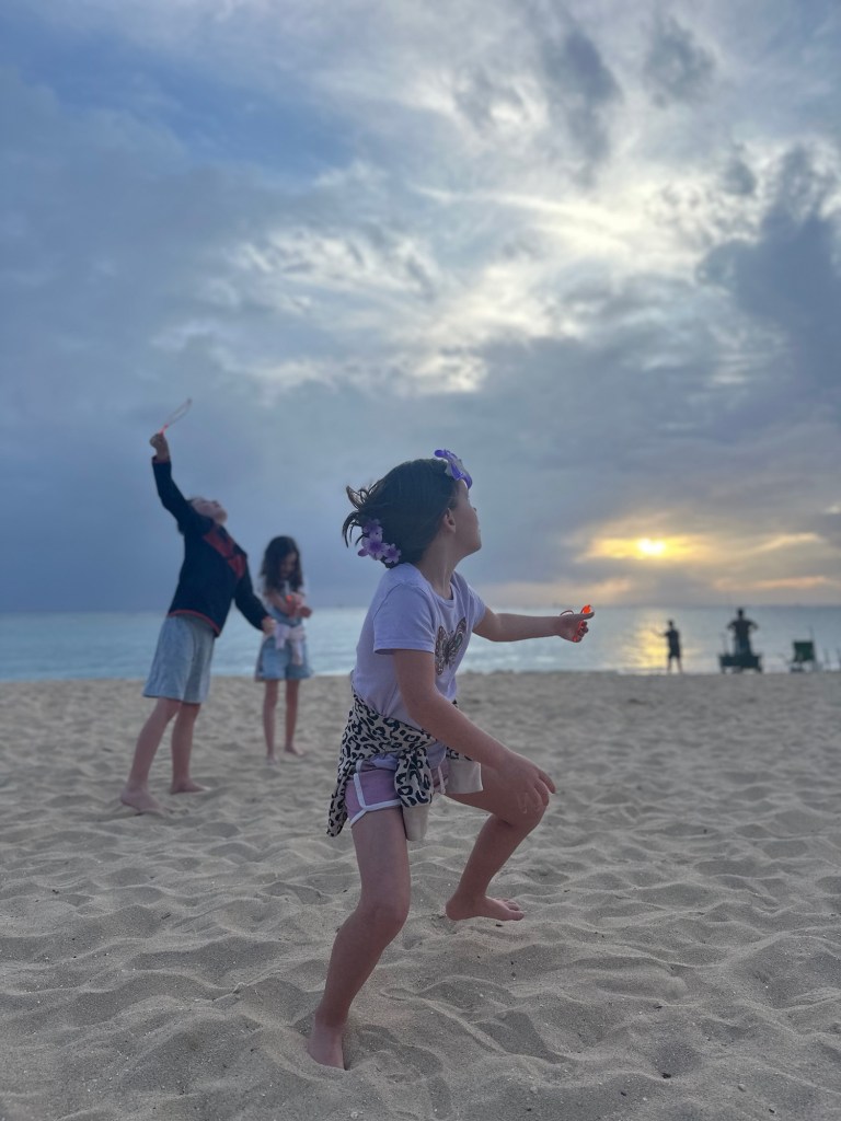 Every Friday night one of the hotels sets off fireworks on the beach. We headed down just after happy hour to catch the show. The beach was not surprisingly very busy. As we were walking along we noticed thatthere were a bunch of kids shooting toys into the sky. Our kids were obviously interested in getting their hands in a set. We found the guy selling the flingers for some reason that we still don’t understand there was another guy who felt very strongly that we should not buy them from the first guy, and said if we bought them from the second guy, he would give us the $20. I’m fairly confident he did not think people would take him up on it, but he doesn’t know Jacob. Jacob gladly took the $20 gave it to the second seller and we walked away with 4 flingers. Those things continued to be a highlight of the trip and we spent a couple of evenings on the beach sending them skywards.