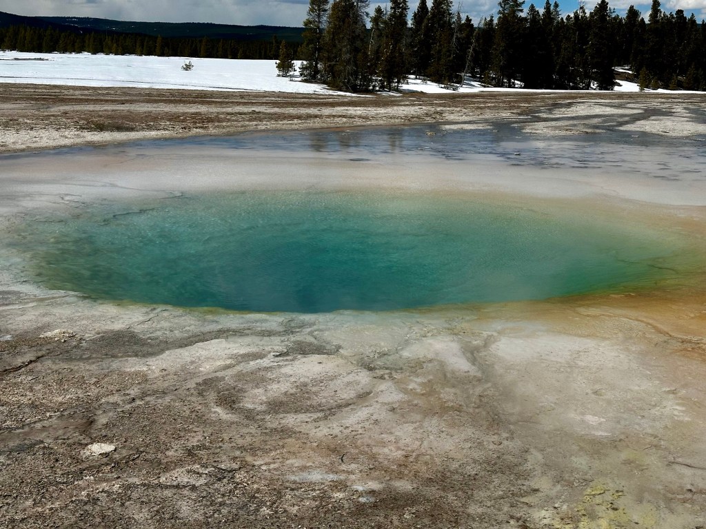 After the geyser we headed back through the park to stop at some of the coloured pools. The Morning Glory basin is the one that is most pictured. We were unfortunately there on a really calm day so we couldn’t really see the pool from all the steam. You can see that there are a bunch of colours, but you’re on a boardwalk that’s not raised, so you can’t really get to see it like the pictures show. You also have to share the walk with people who think its fun to throw things in the pools to see what happens. Sharing nature with people has its drawbacks.