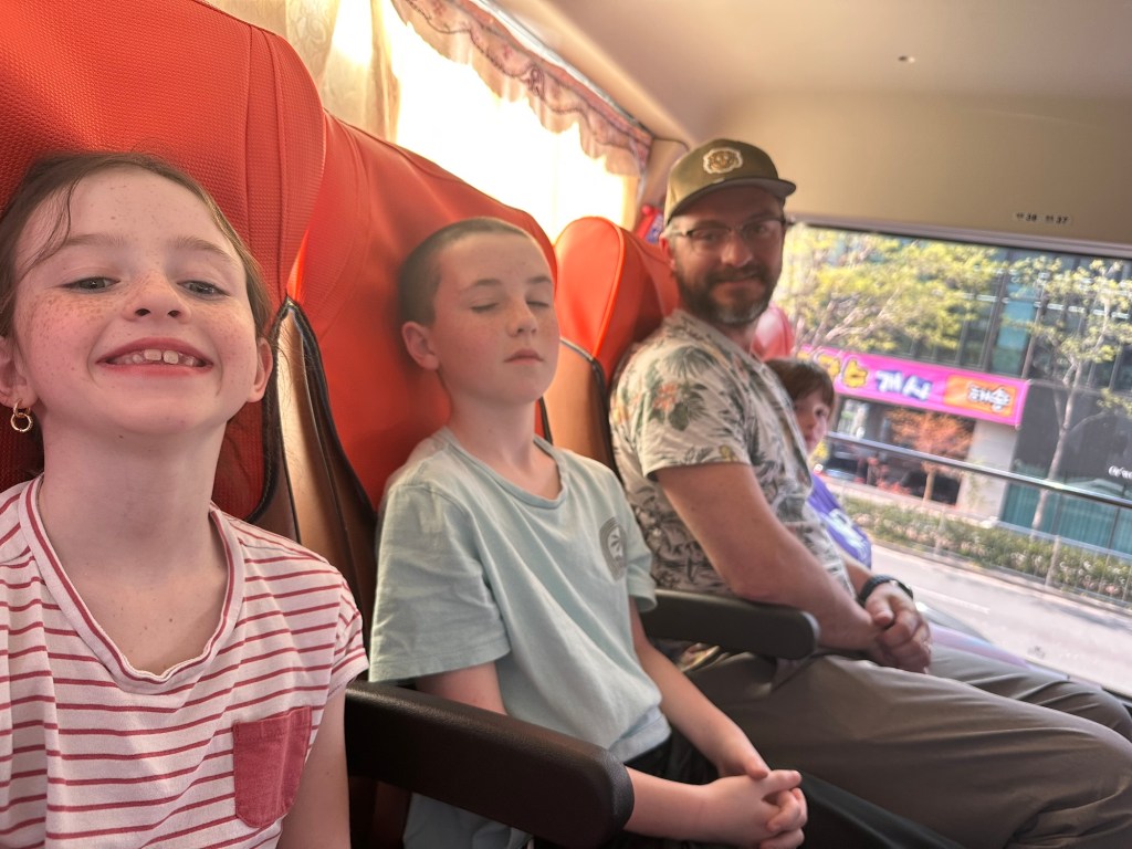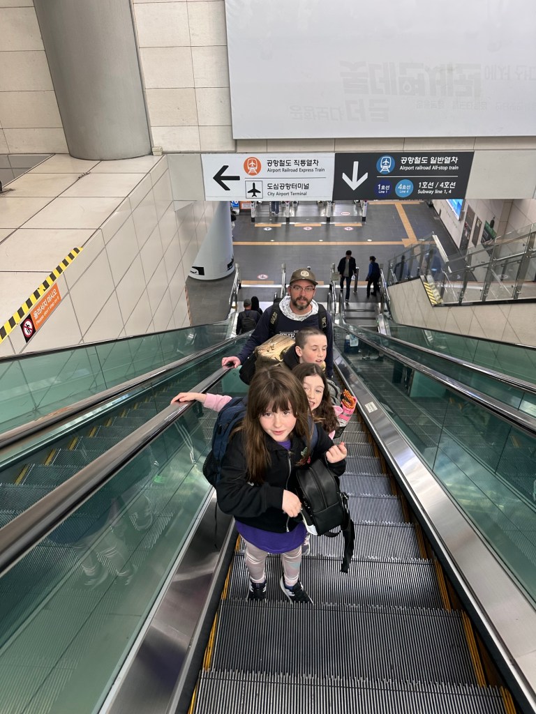 It’s been a number of years since we have done any significant flights. The last time we did any serious long haul travel would have been our trip to Portugal in 2020 and even that is accomplished in relatively few hours of flying. Asia is a whole other beast. We set off from home at 4am Sunday morning for the 5:20 flight. We connected in Toronto and Vancouver with just enough time in each to pee, grab a snack and get to our gate. Three flights, almost exactly 24 hours (19 of them in the air), we landed in Seoul. The kids were total champs on the flights.
