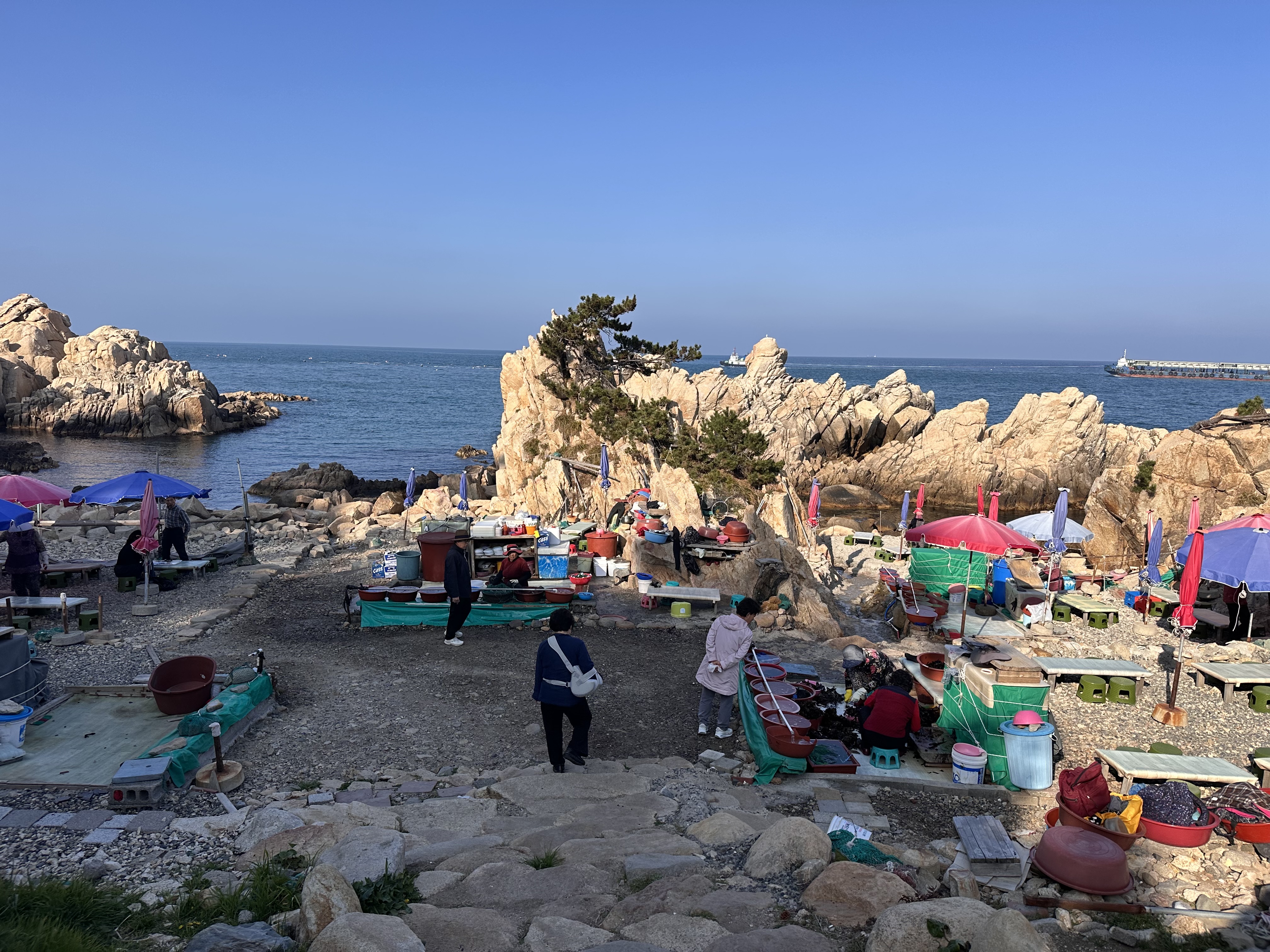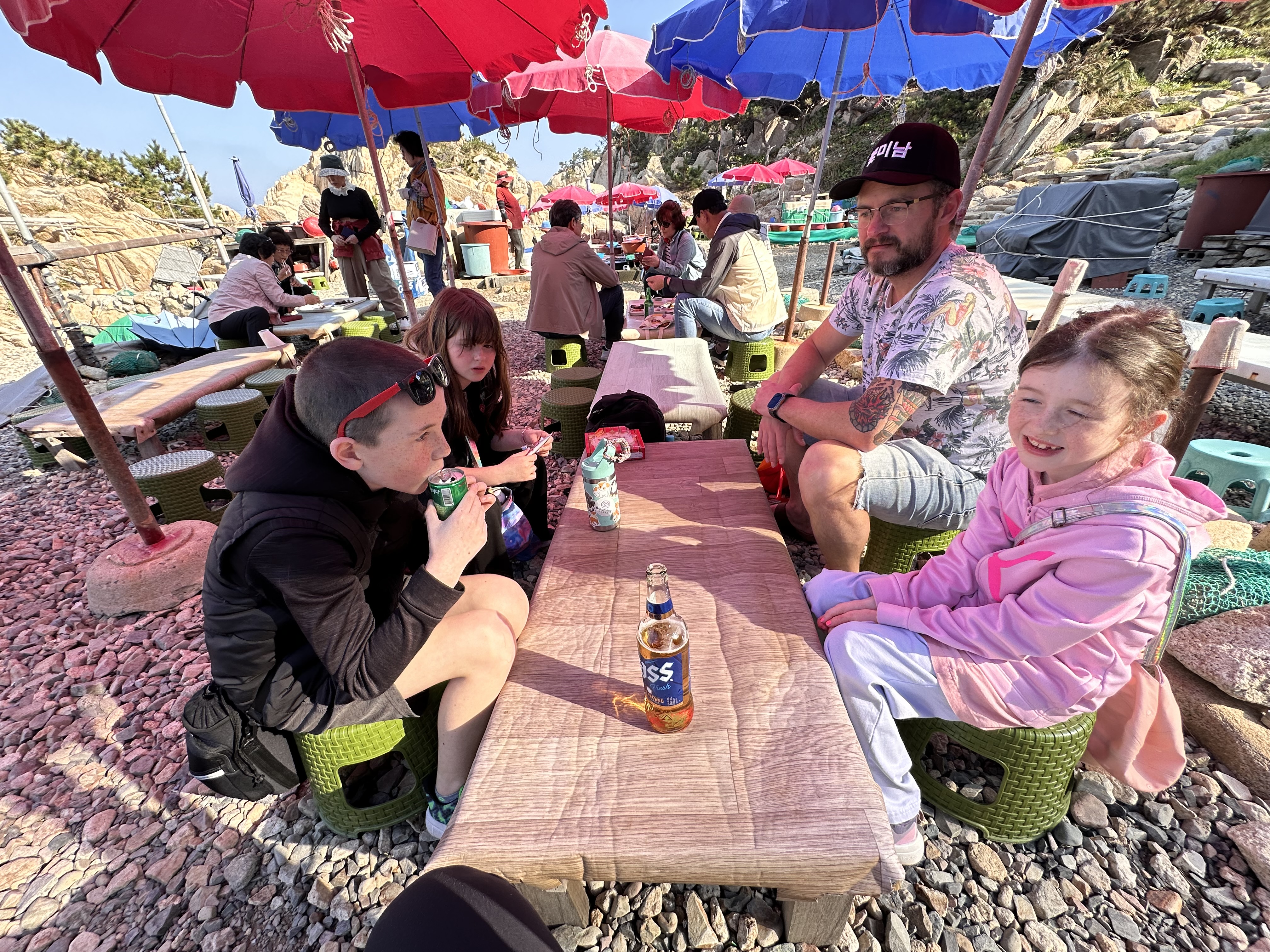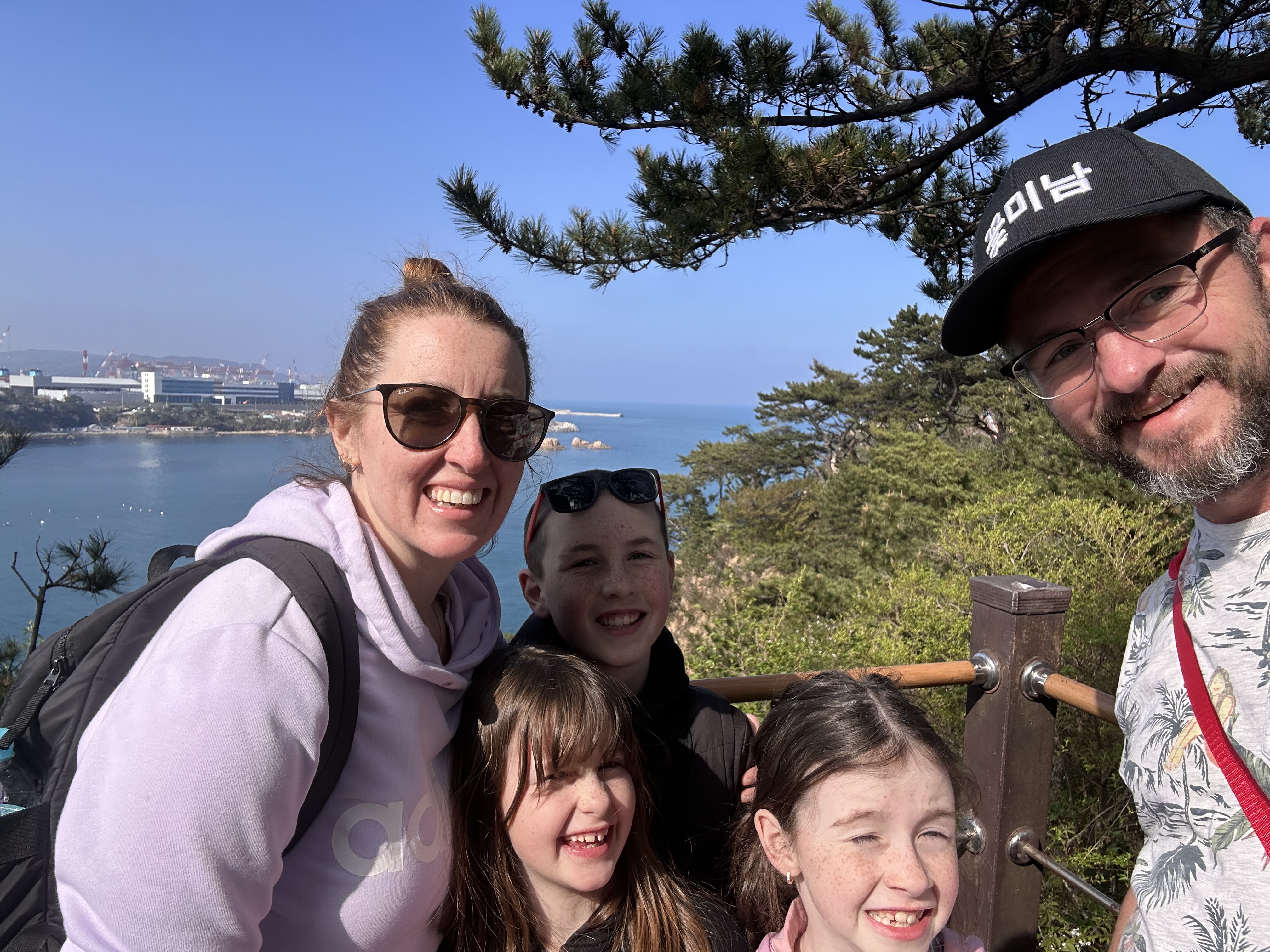 We hiked up the seemingly never-ending staircase to the new to us suspension bridge. It offered great views back over the beach and the expanded Hyundai factory. We eventually made our way down to the ajumma fish markets. The kids got to see one of them taking her nets out of the water. Jacob and I shared a mekju, the kids shared a chilsing until we hiked back down and made our way to Nammok for dinner.
