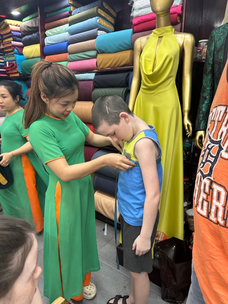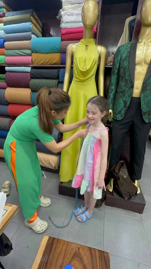 Hoi An is known for its tailor shops. It’s pretty popular amongst tourists and there are blocks and blocks of shops devoted to the trade. The general idea is, you show up with either your own idea or look through Pinterest when you arrive, choose your material, get your measurements done and then haggle on a price. Within the next 24-48 hours they’ll have your stuff ready for your first fitting where you can make any tweaks that you want or need. Everything is then ready to go the following day.