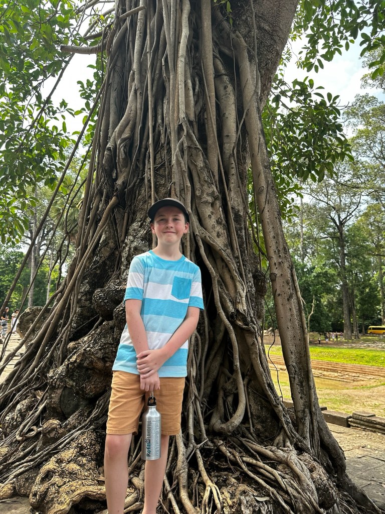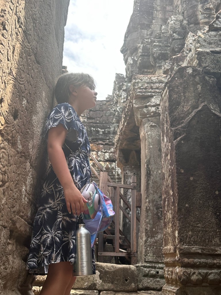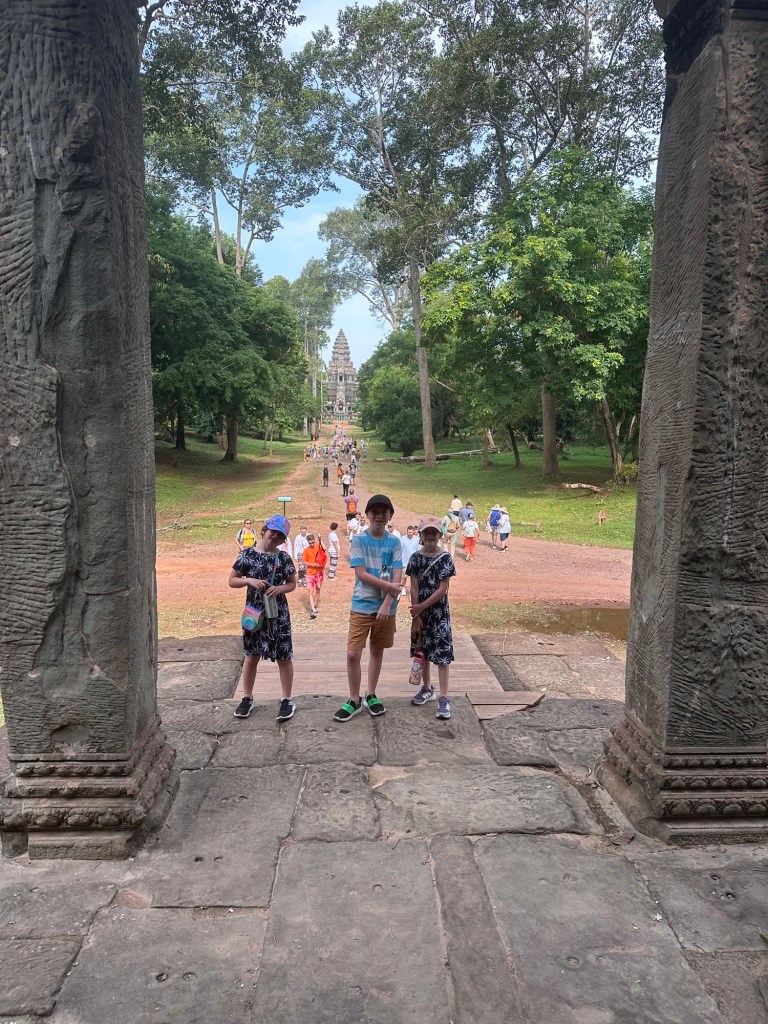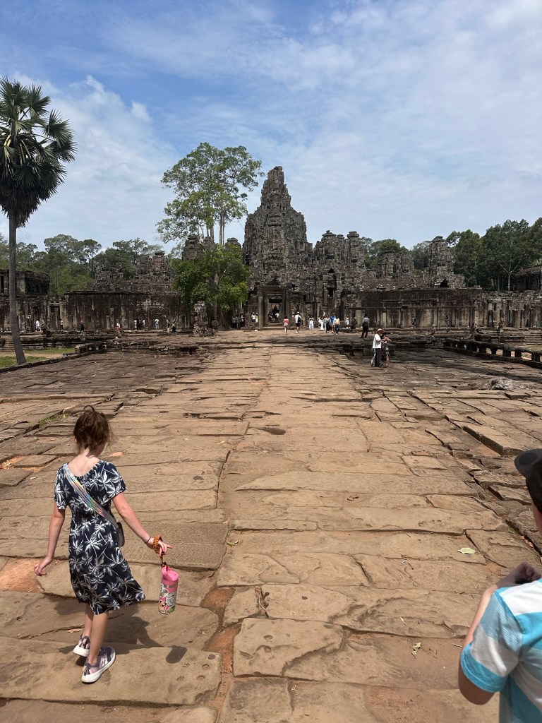 We started our day bright and early with Mr. Toukla to try and beat some of the heat. We made a quick pit stop for tickets and then hit the temple trail. First stop is Angkor Wat – the largest and most recognizable of the temples. Unfortunately we weren’t allowed to climb to the top for the amazing view (kids aren’t allowed because the steps are so steep) but we still got to wander around plenty. We eventually made our way over for our first water and shade break of the day. It’s only 9:00, we are at our first temple and we are all already awash in sweat!