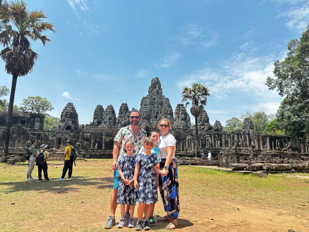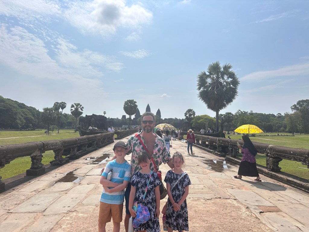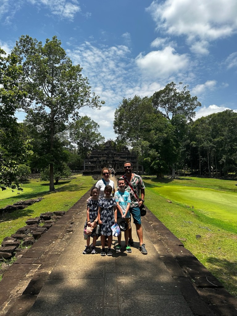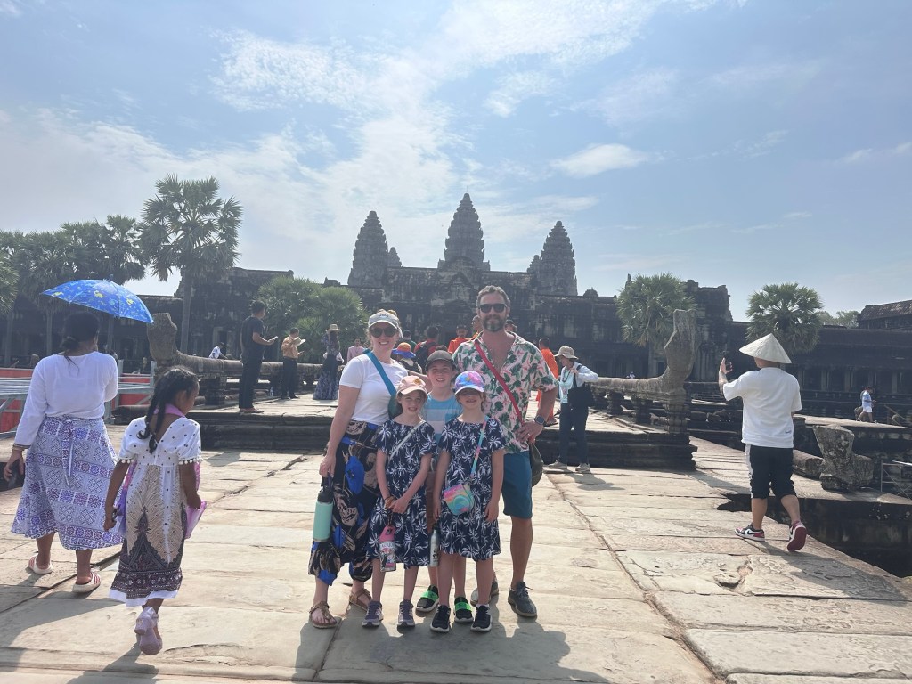 We started our day bright and early with Mr. Toukla to try and beat some of the heat. We made a quick pit stop for tickets and then hit the temple trail. First stop is Angkor Wat – the largest and most recognizable of the temples. Unfortunately we weren’t allowed to climb to the top for the amazing view (kids aren’t allowed because the steps are so steep) but we still got to wander around plenty. We eventually made our way over for our first water and shade break of the day. It’s only 9:00, we are at our first temple and we are all already awash in sweat!