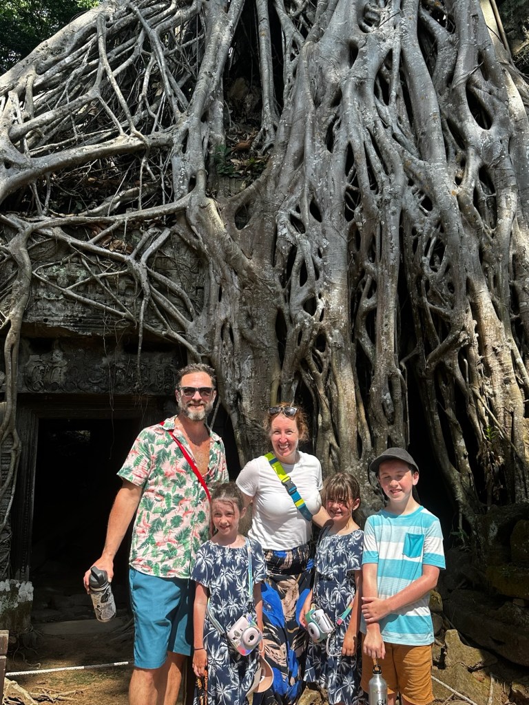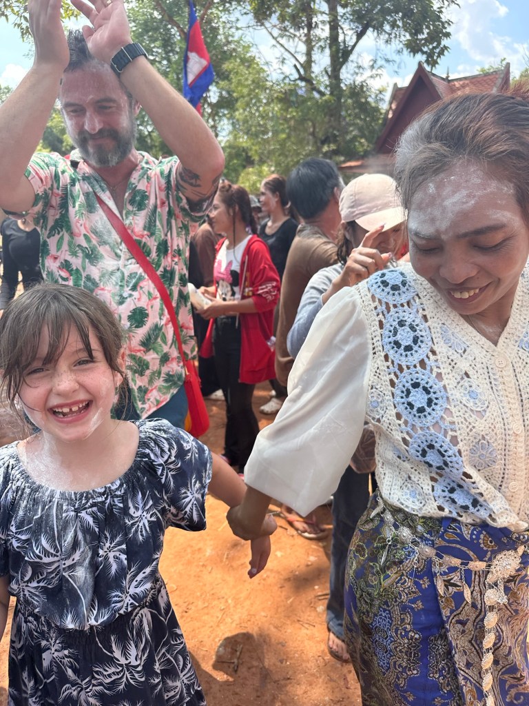 After a bite to eat we had one more temple (the one with the trees) that we wanted to see before we planted ourselves in the pool and attempted to recover from the heat. We stepped out of our restaurant to trucks full of people playing loud music and throwing water. It is the end of Khmer New Year and it’s celebrated by these impromptu parades/water fights. We were invited to join in the celebration and danced around for the next 20 minutes being doused with powder and cold water. The kids were an especially big hit – people were snapping their pictures, giving hugs and helping them navigate the mud. It was a highlight for everyone.