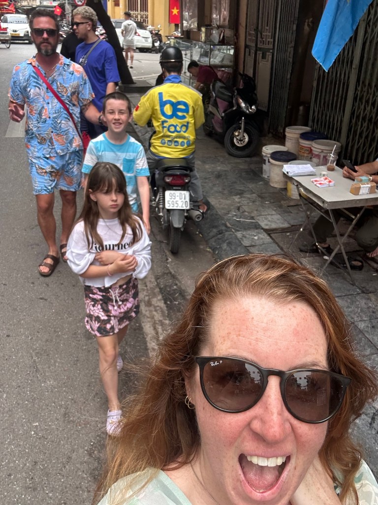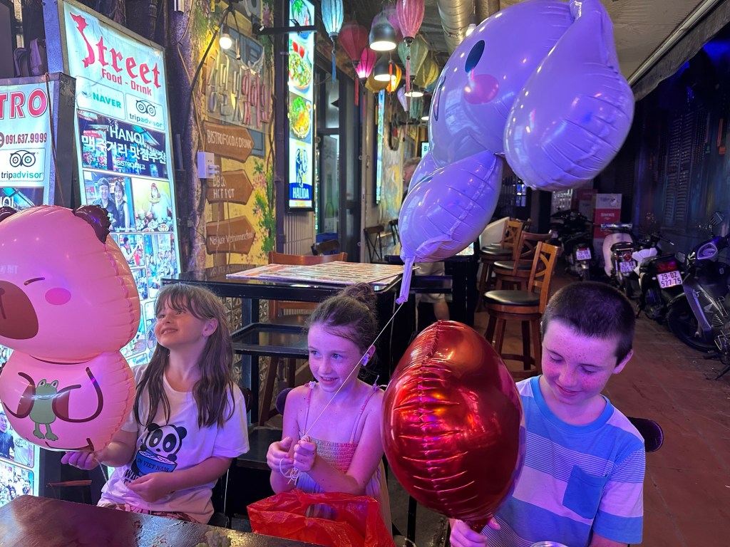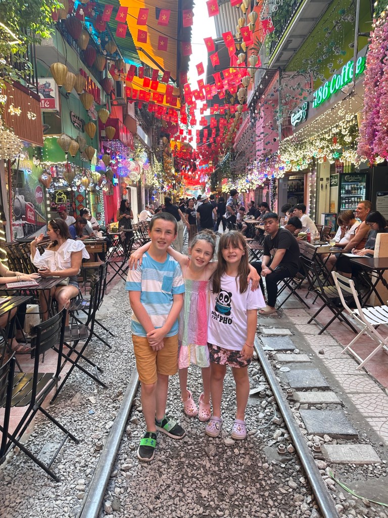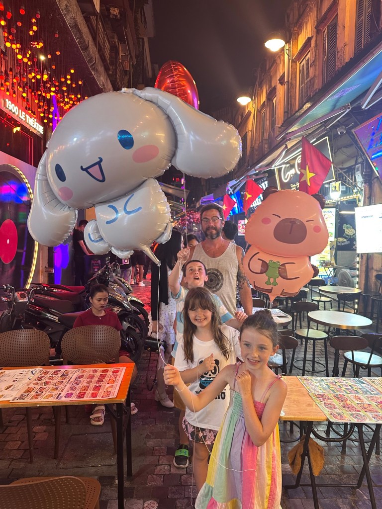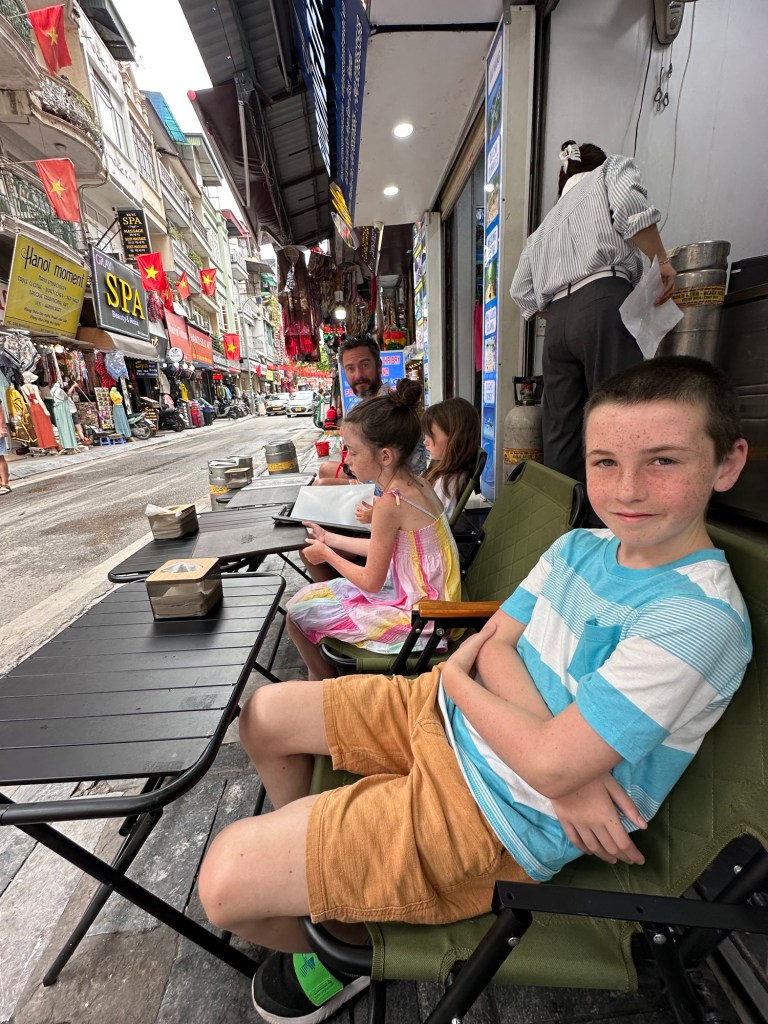 After lunch we made our way back towards our hotel area to take a rest and get ready for a late dinner. We got a little distracted en route by coffee – experiencing our first egg coffee – something I’m now so disappointed I waited this long to drink. It’s essentially a large espresso shot with a dollop of boiled icing on top. We then got distracted again by the nearly ubiquitous call of masssaaaggeee. We haggled down for a family price ($50 for 60 minutes for the 5 of us!) and climbed the stairs to an open room with 4 massage chairs and 5 massage beds. It was clean enough, I mean, it’s not passing any North American health and safety regulations either, but so far none of us have any visible rashes a week later. Jacob and I had two Vietnamese men crawl over our backs (literally) while the kids had three Vietnamese women giggle and hug them and tell them how cute they were during their massage.