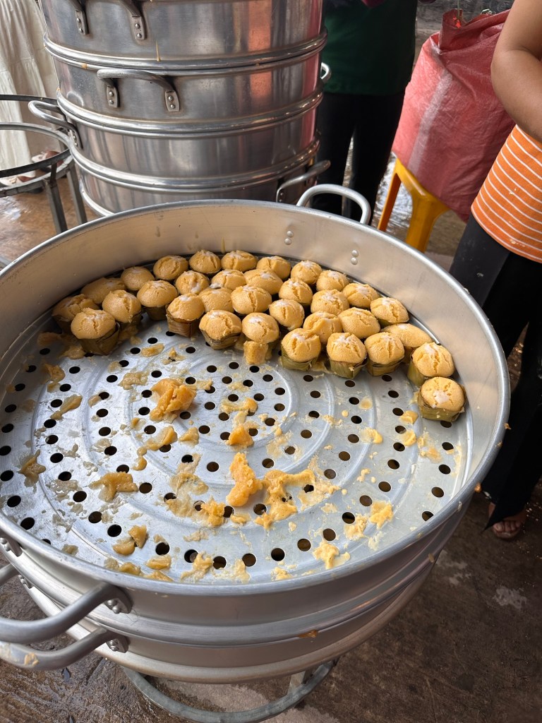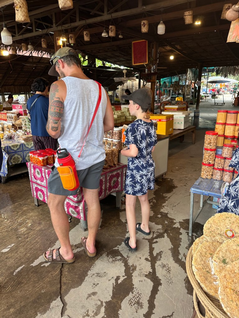 They gave us a wonderful tour through their gardens and showed the kids the entire lifecycle of the butterfly – they got to see and hold cocoons, pupae, caterpillars and one huge moth. The gardens were stunning but so hot. We wrapped up our time there and headed back with Mr. Toukla. On our way back to the city he took us to a little market where they had cakes made from palm plants. We had these little rice cakes with sugar cubes in them, warm palm cakes with coconut cream in them and some kind of jelly with coconut. Everything but the jelly was delicious – especially the rice balls.